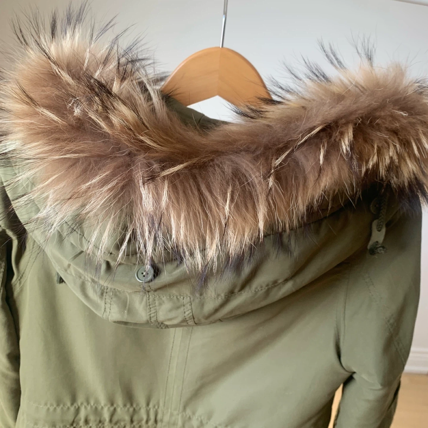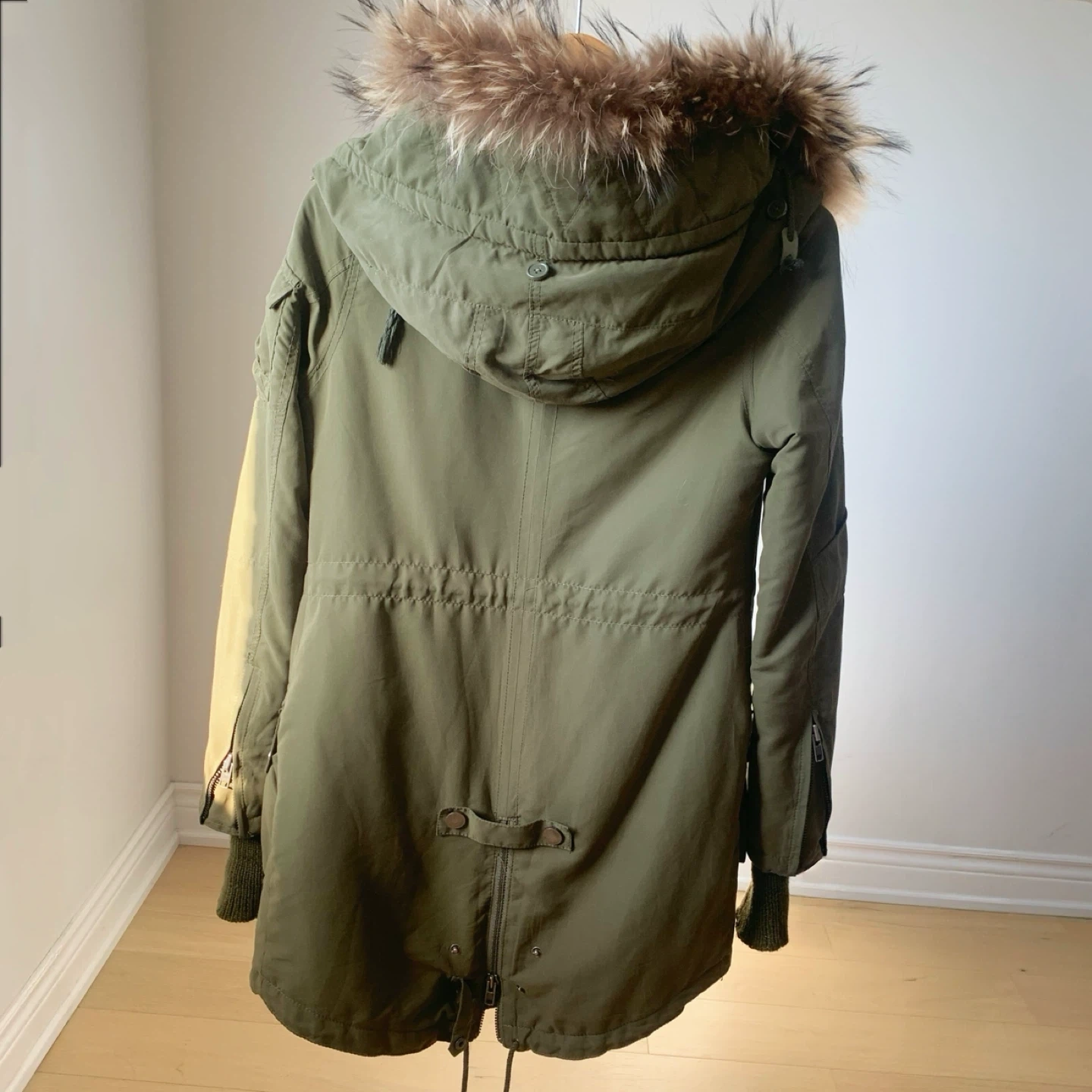 • Faux fur trimmed hood