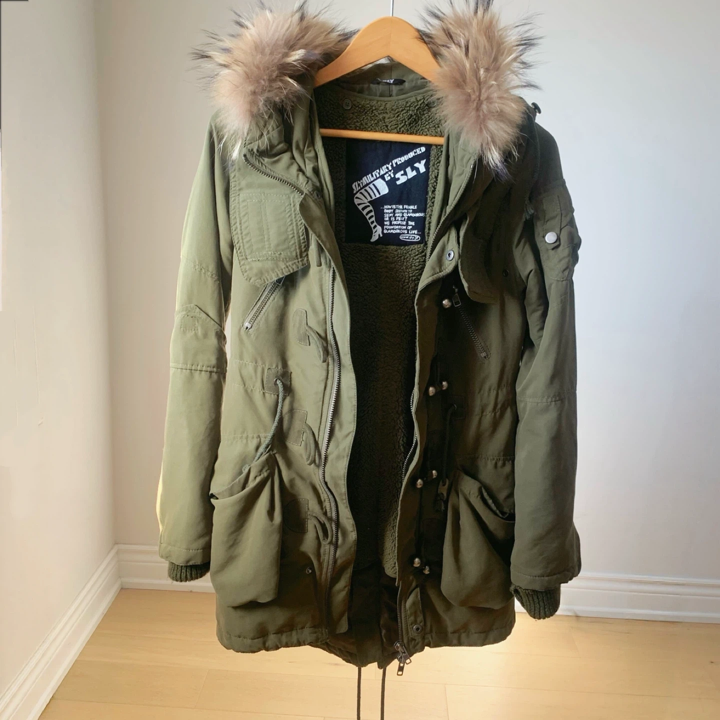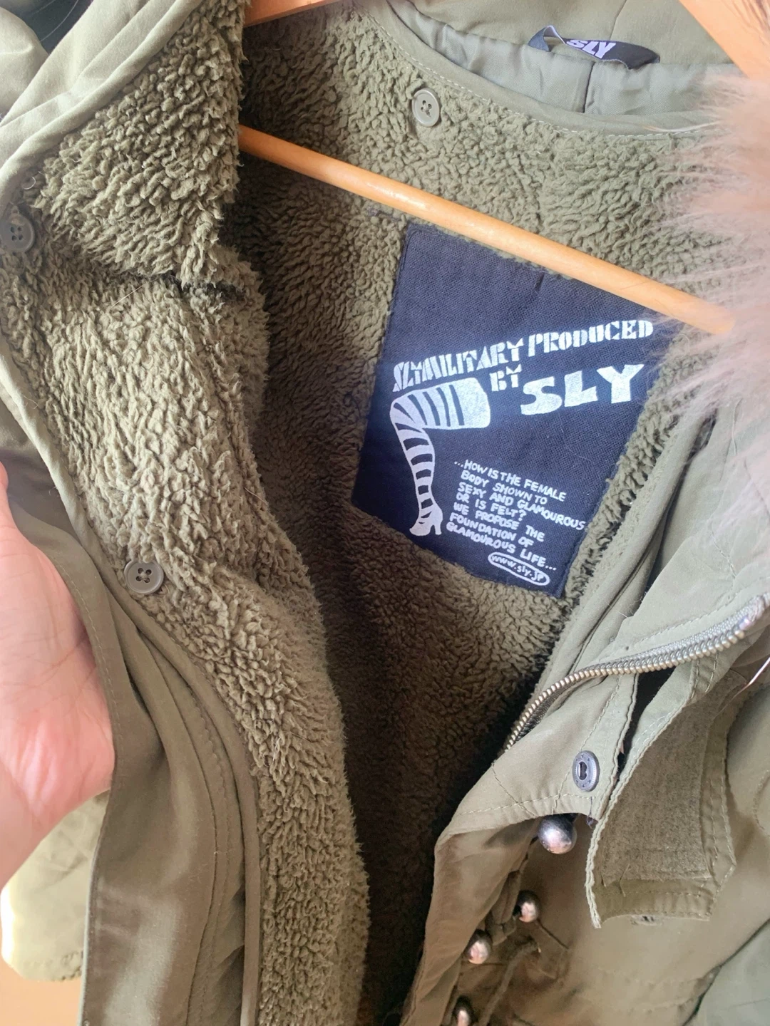 SLY Japan parka jacket in a classic olive green tone.