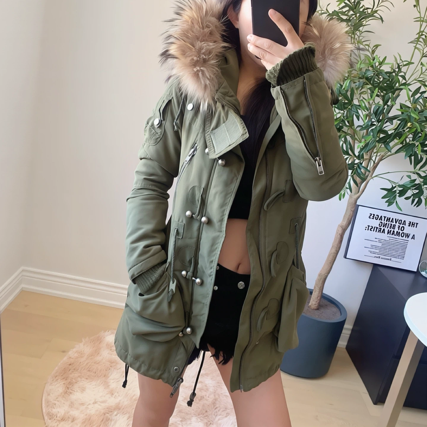 • Faux fur trimmed hood