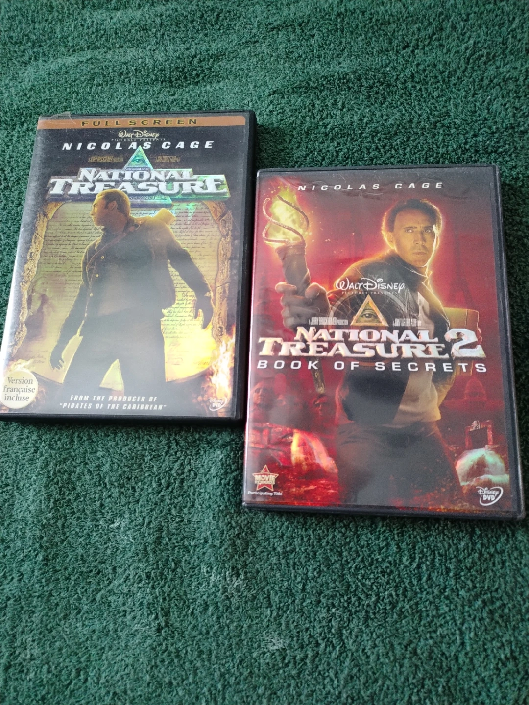 This bundle includes the Disney DVDs for National Treasure and National Treasure 2: Book of Secrets. Both feature Nicolas Cage and are full screen versions. "National Treasure" also includes French language version.