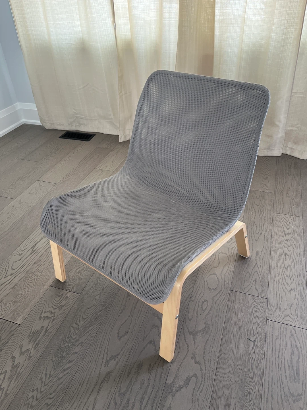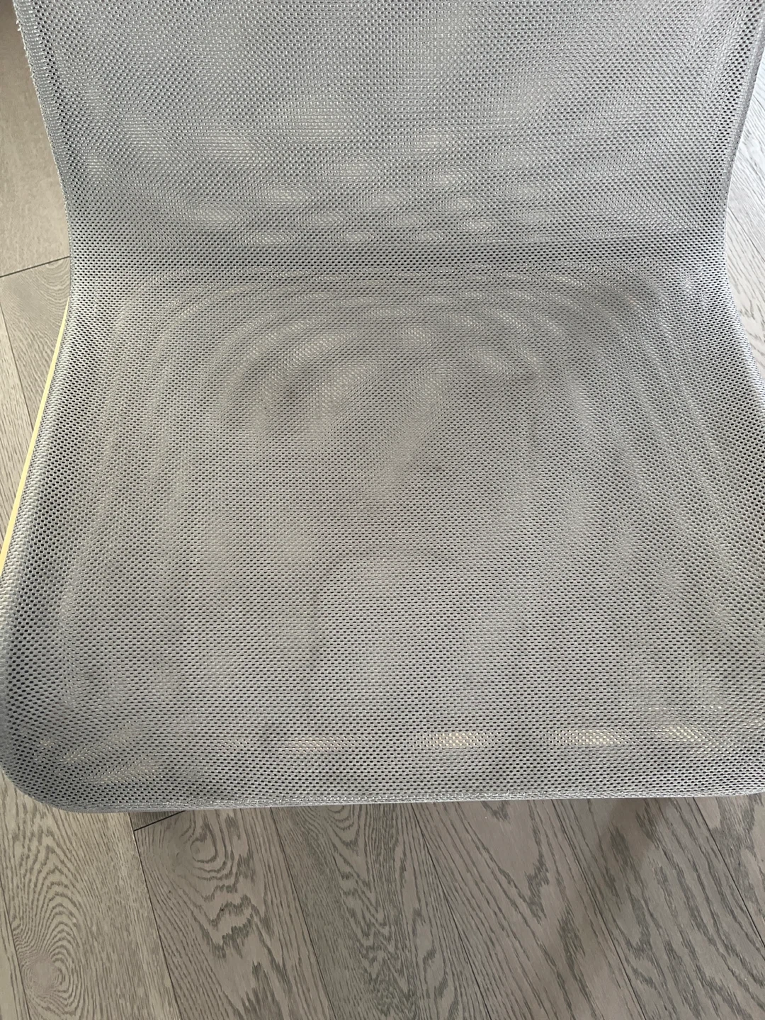 A stylish chair featuring a breathable grey mesh seat and backrest. It's supported by a bentwood frame, offering a modern look. This chair's design makes it comfortable for extended sitting.(It has two stains that come off with a simple wash)