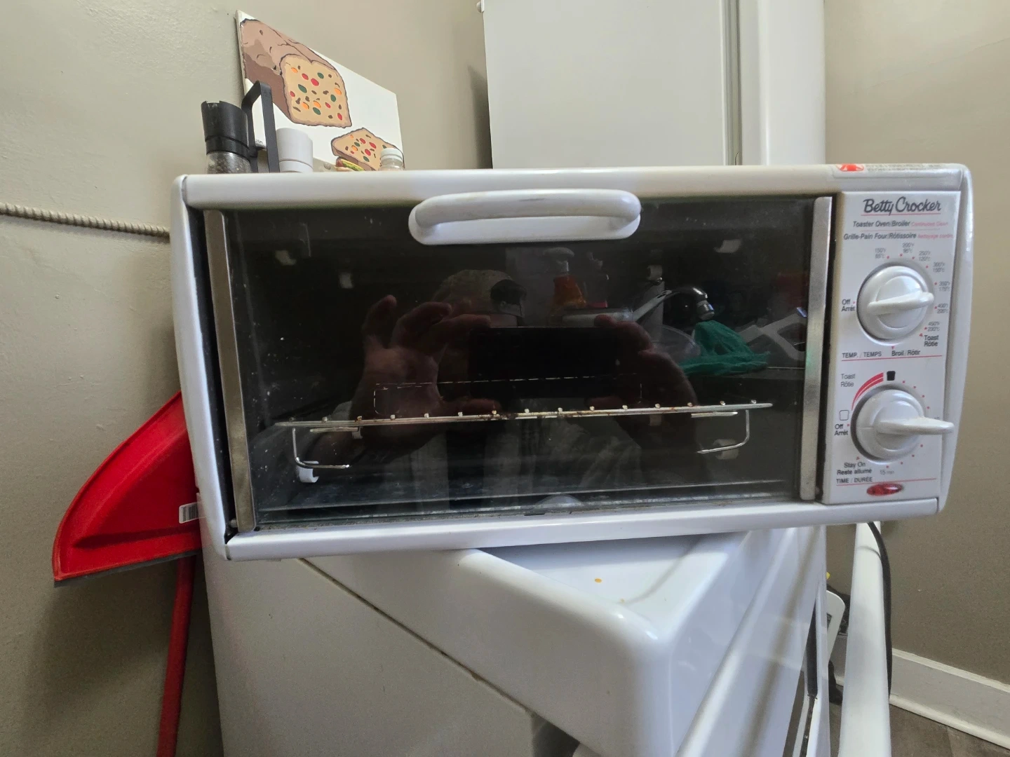 This is a Betty Crocker toaster oven broiler. It has adjustable temperature and timer settings for toast, broil, and rotisserie functions. It's white and comes with a door handle and interior rack.