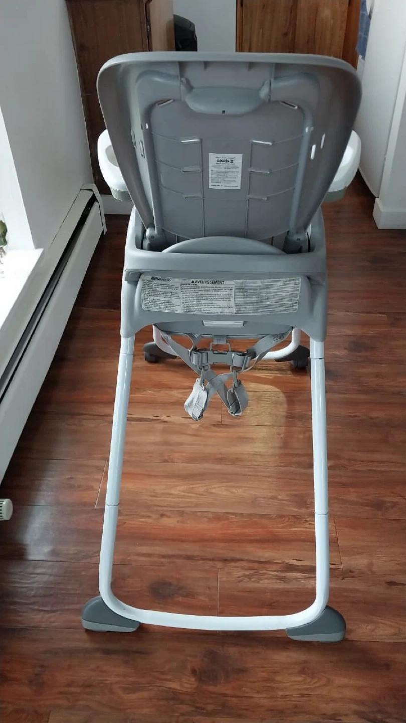 Ingenuity baby high chair. It has a removable tray with cup holders. Tray is dishwasher safe. Collapsible for easy storage.