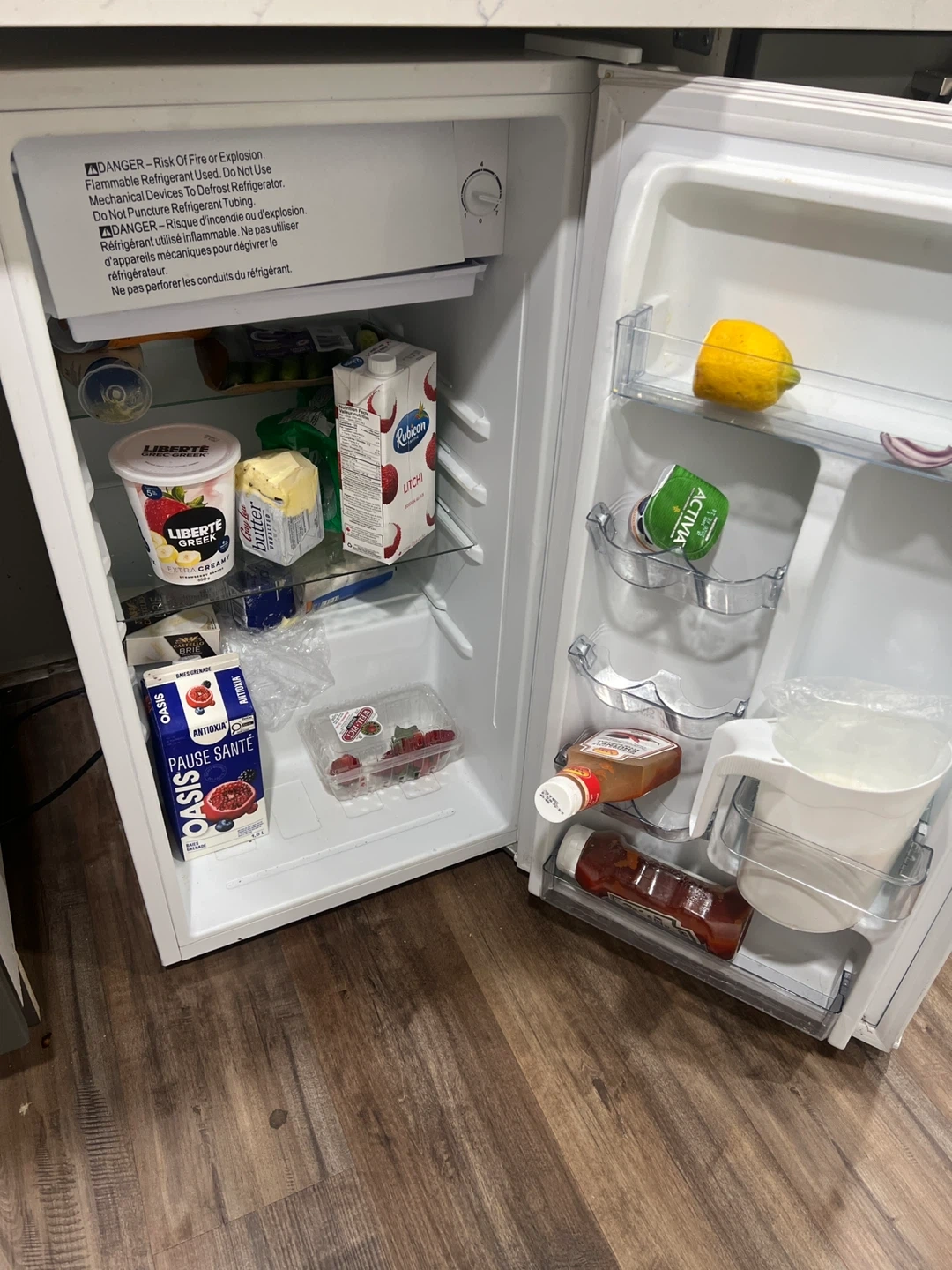 Galanz white mini fridge. It's perfect for keeping drinks and snacks cool in a small space. This unit has a compact design and includes door shelves for extra storage.