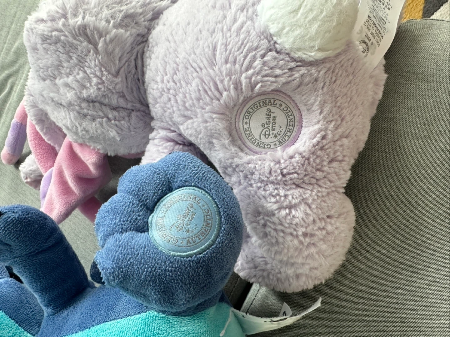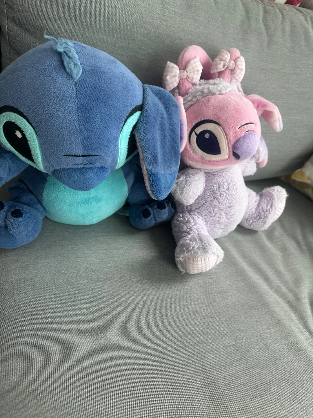 Two plush toys, one blue Stitch and one pink Angel. Both are soft and cuddly stuffed animals. They're from the Disney Store!