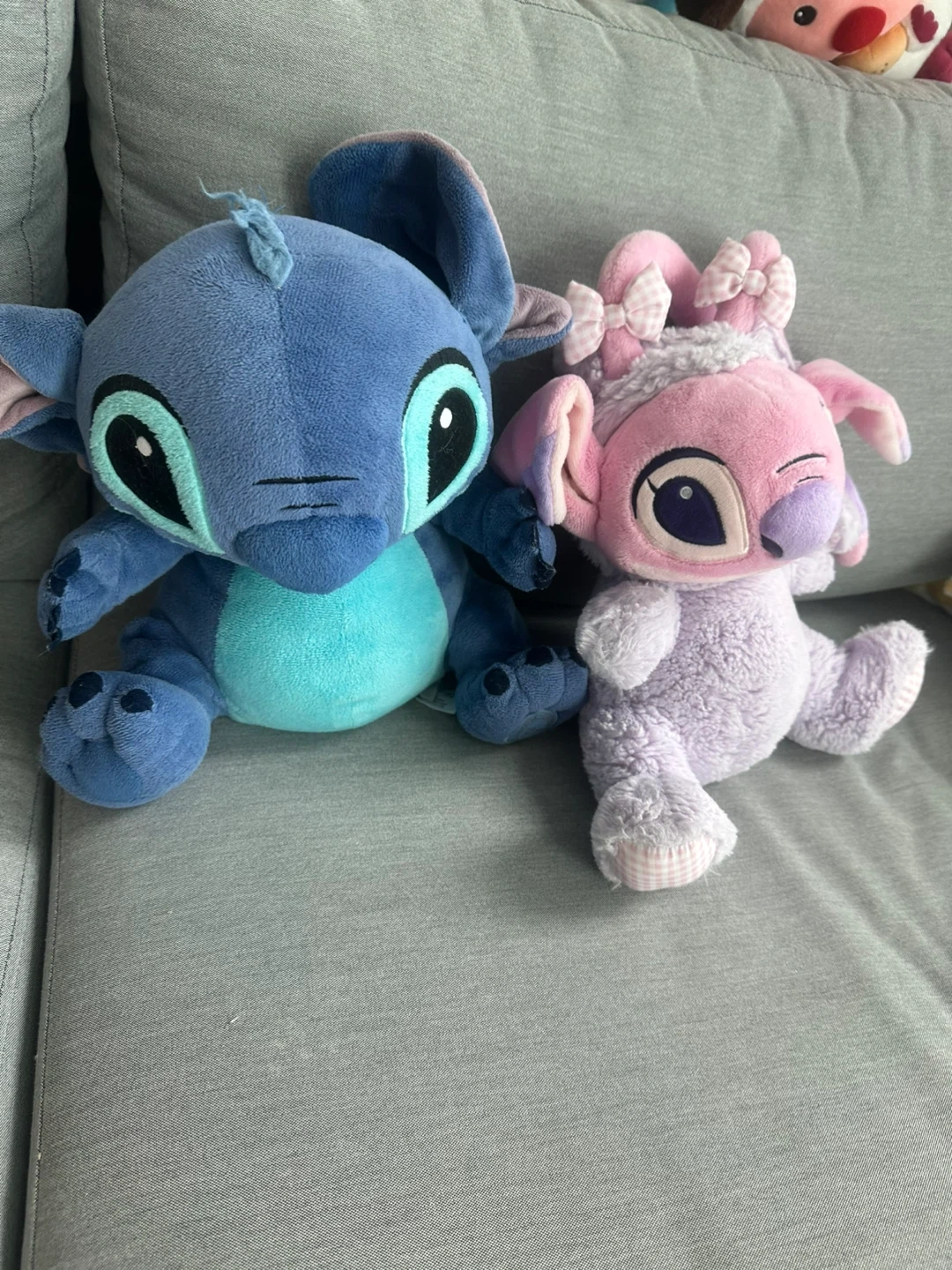 Two plush toys, one blue Stitch and one pink Angel. Both are soft and cuddly stuffed animals. They're from the Disney Store!