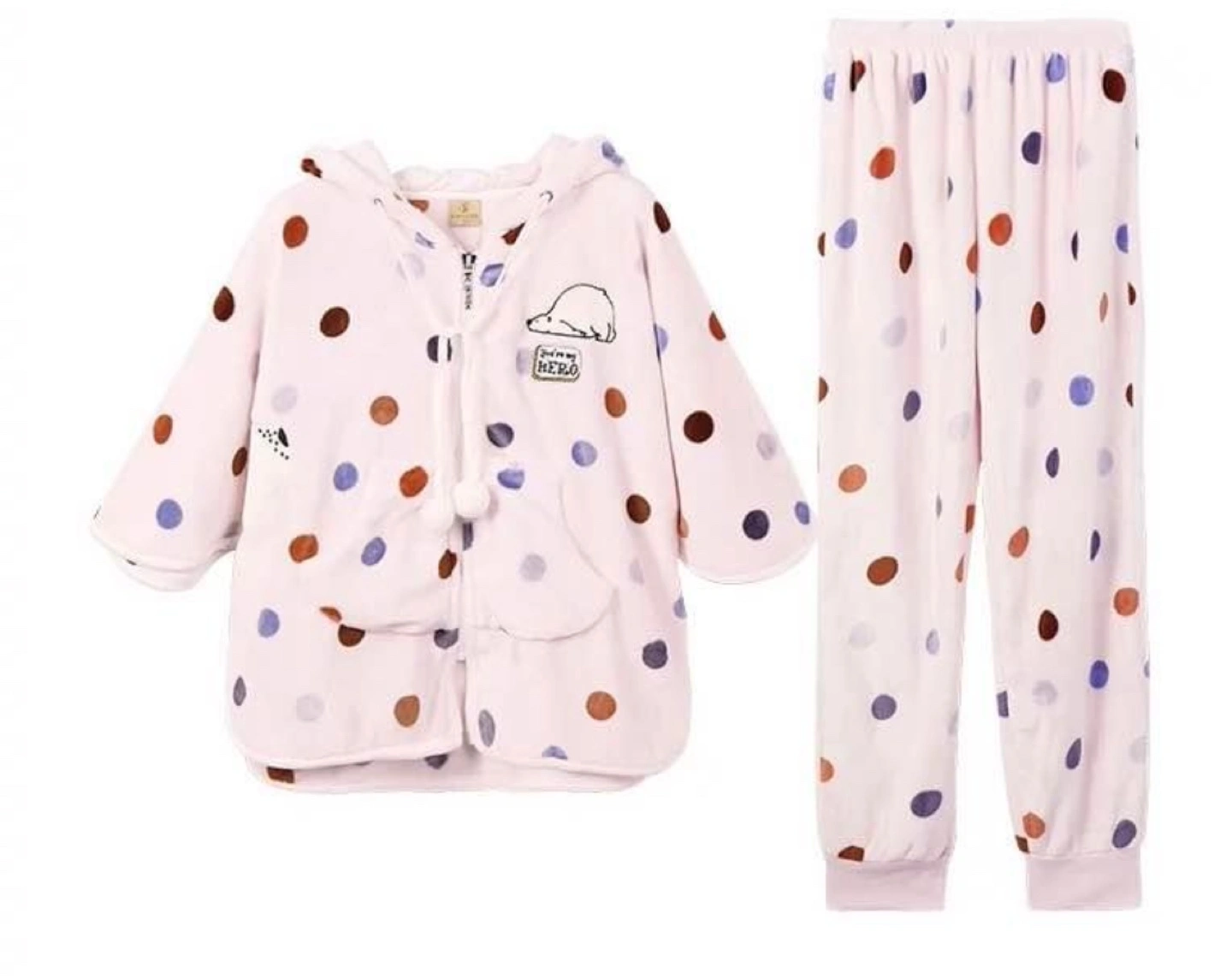 Adorable hooded fleece pajama set. Features a pink base with colourful polka dots. Includes matching pants. Soft and cozy.