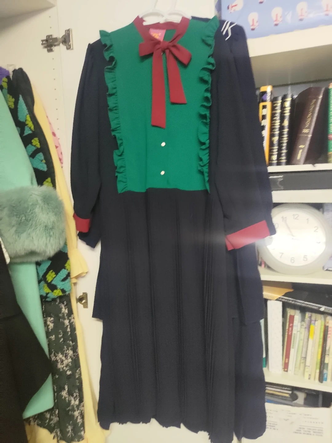 Selling a cute vintage-style dress! It features a green bodice with ruffles and a red bow, along with a navy skirt and sleeves. It's in great condition and ready for a new home in your closet!