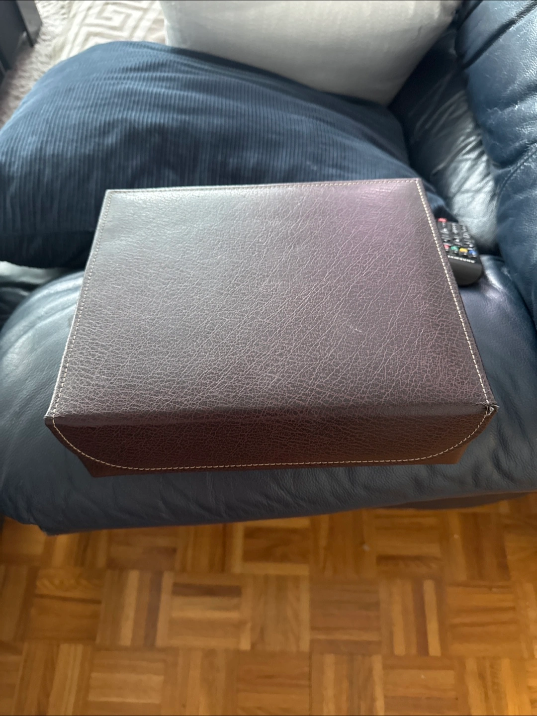Great storage for your favourite treasures. Features compartments and lined interior. It is brown and square in shape. Genuine leather and very sturdy