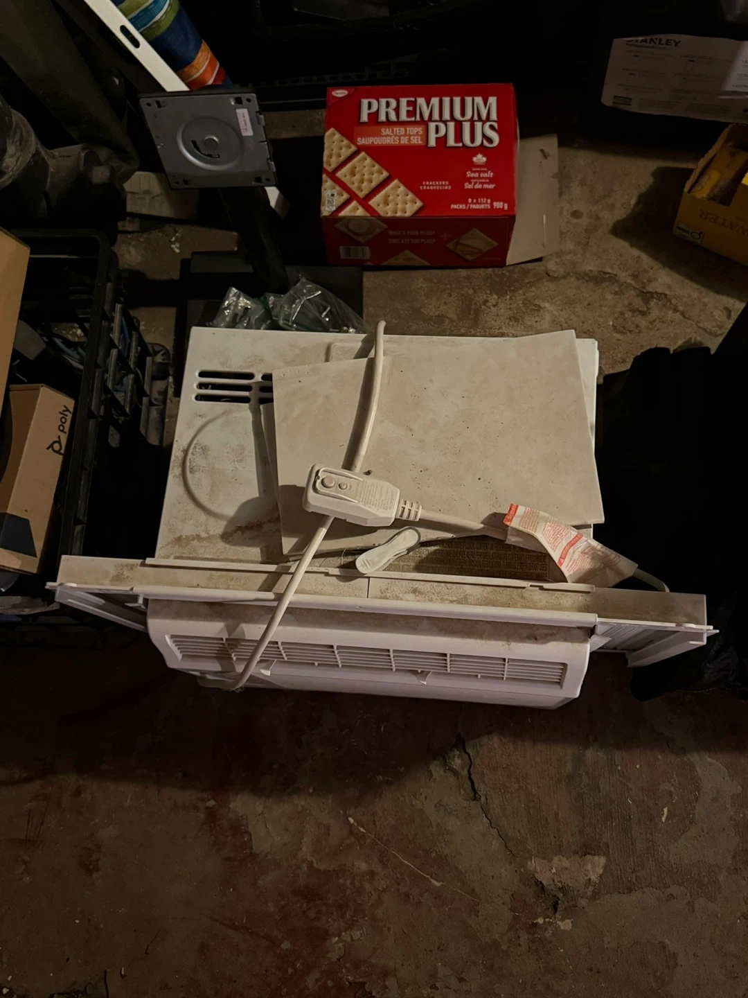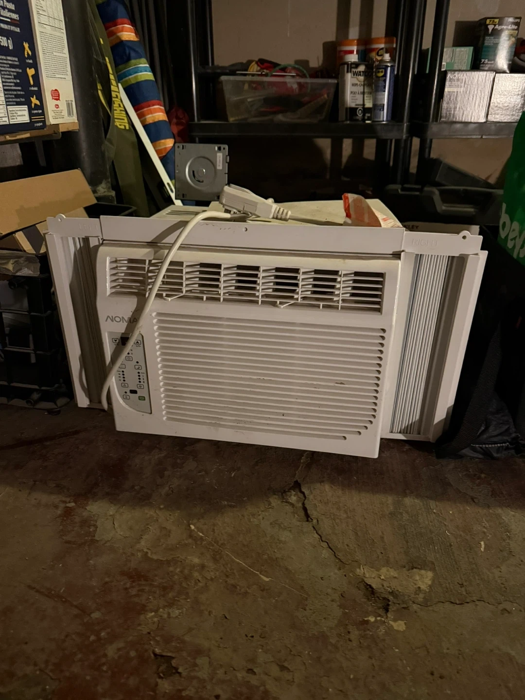 White AOM window air conditioner. It has multiple fan speeds and cooling settings. Comes with a power cord. Works well, no longer needed