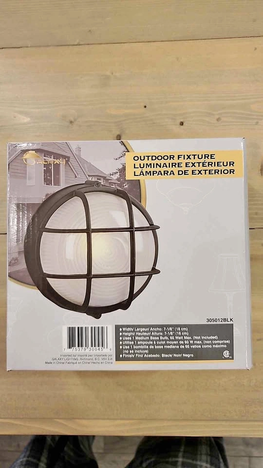 Brand new in box, never installed. This is the Galaxy Marine 7.125-in Black Caged Frosted Glass Outdoor Wall Light. It's CUL listed and comes with a guard. Some assembly is required. It needs a 60-watt A19-shape medium-base (E-26) frosted incandescent light bulb, which is not included. I purchased this new and accidentally broke the glass of my existing fixture when changing a bulb, so I used the glass from this one. Asking $10. Pick up in the Surrey/Clayton area (194th and 68th Ave). Thanks for looking!