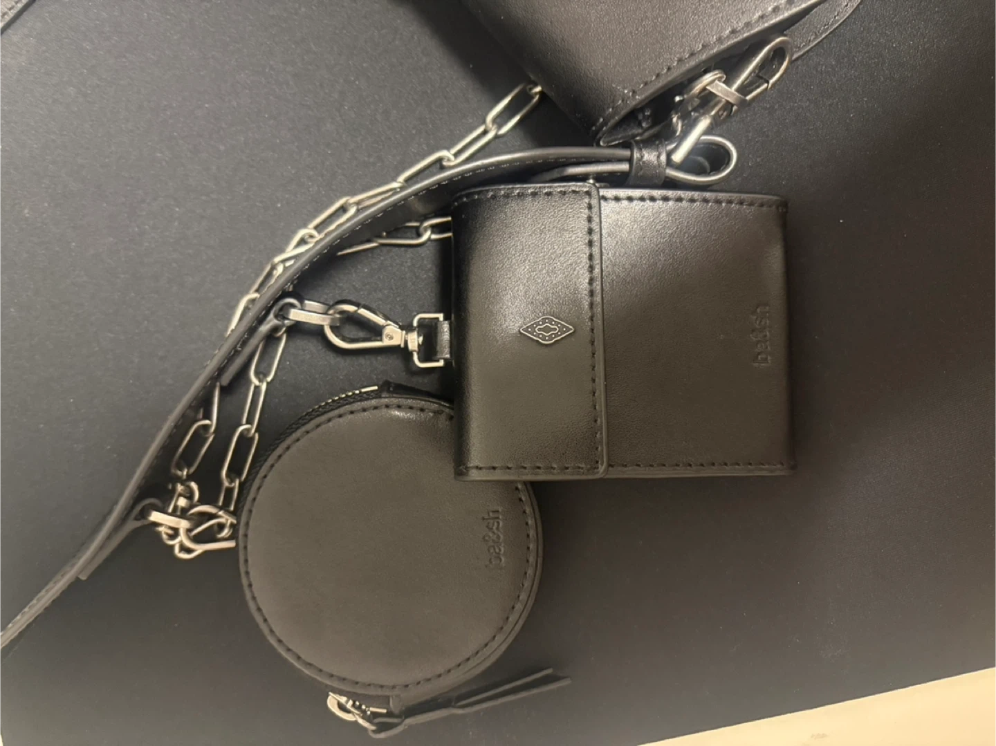 A black leather shoulder bag from Bash. It's accented with a silver buckle and a chunky silver chain strap. Includes a detachable coin pouch and a cardholder. Leather material.
