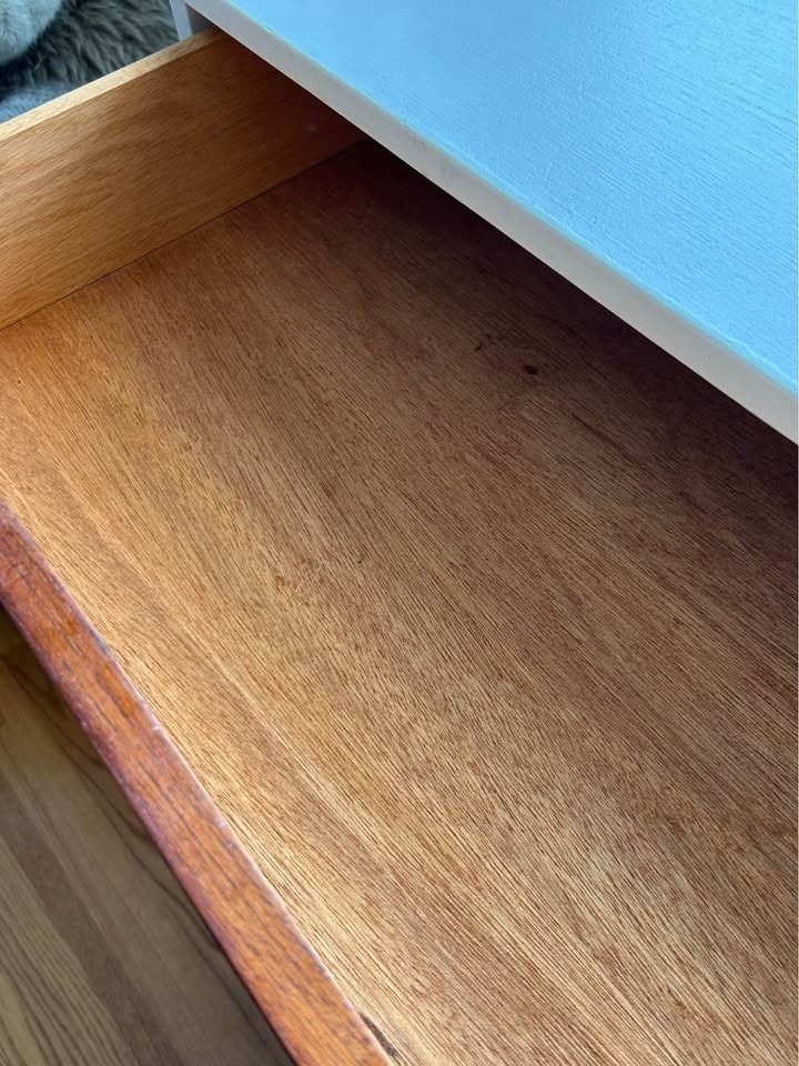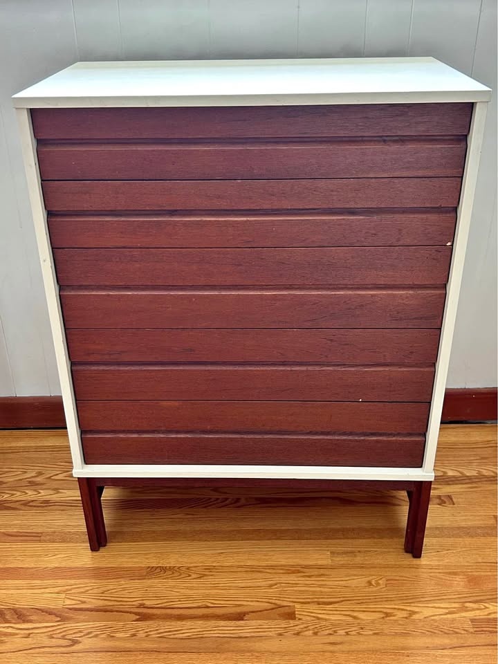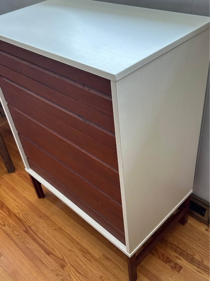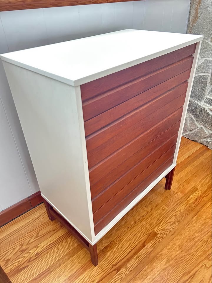 Mid-century Modern tallboy dresser. Walnut. Refinished with trim painted white. Very solid and sturdy. 5 Drawers. Size: 31" wide, 18" deep, 40.5" tall. Made in Canada. Two chips in front drawer wood, see last pic. Smoke free, bug free home.