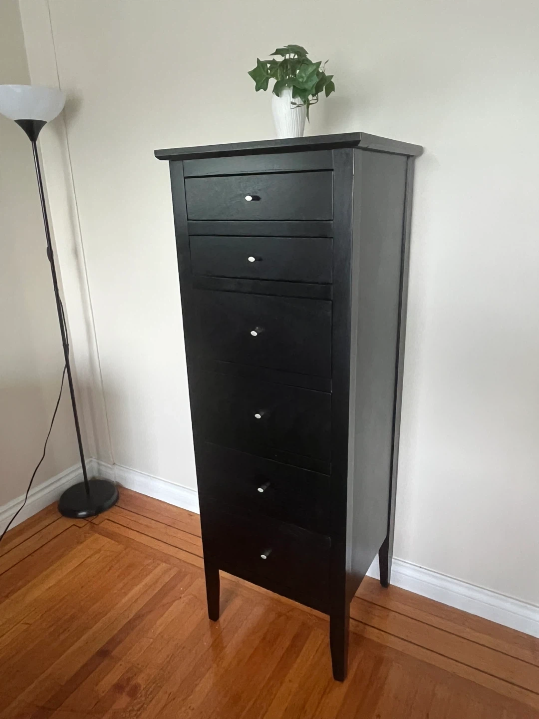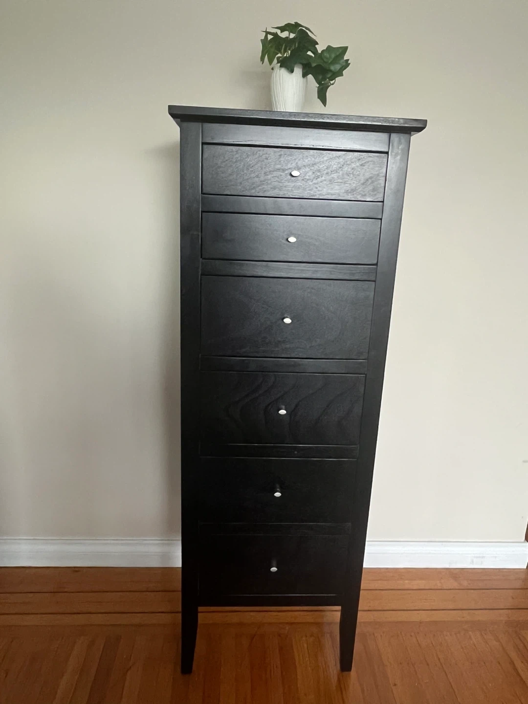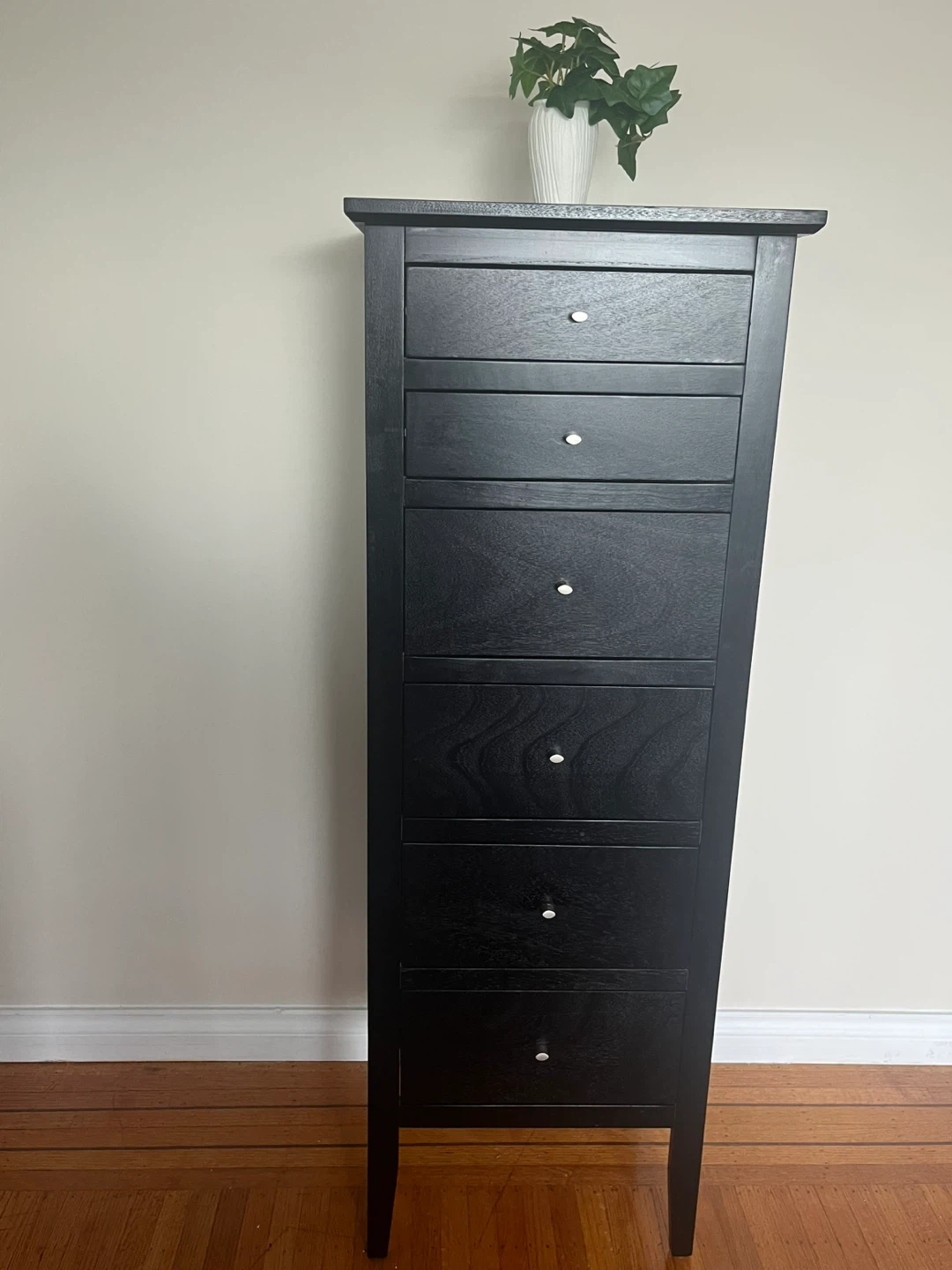 This is a tall, black dresser with six drawers. It has a sleek design and is perfect for storing clothes or other items. The drawers have simple white pulls.