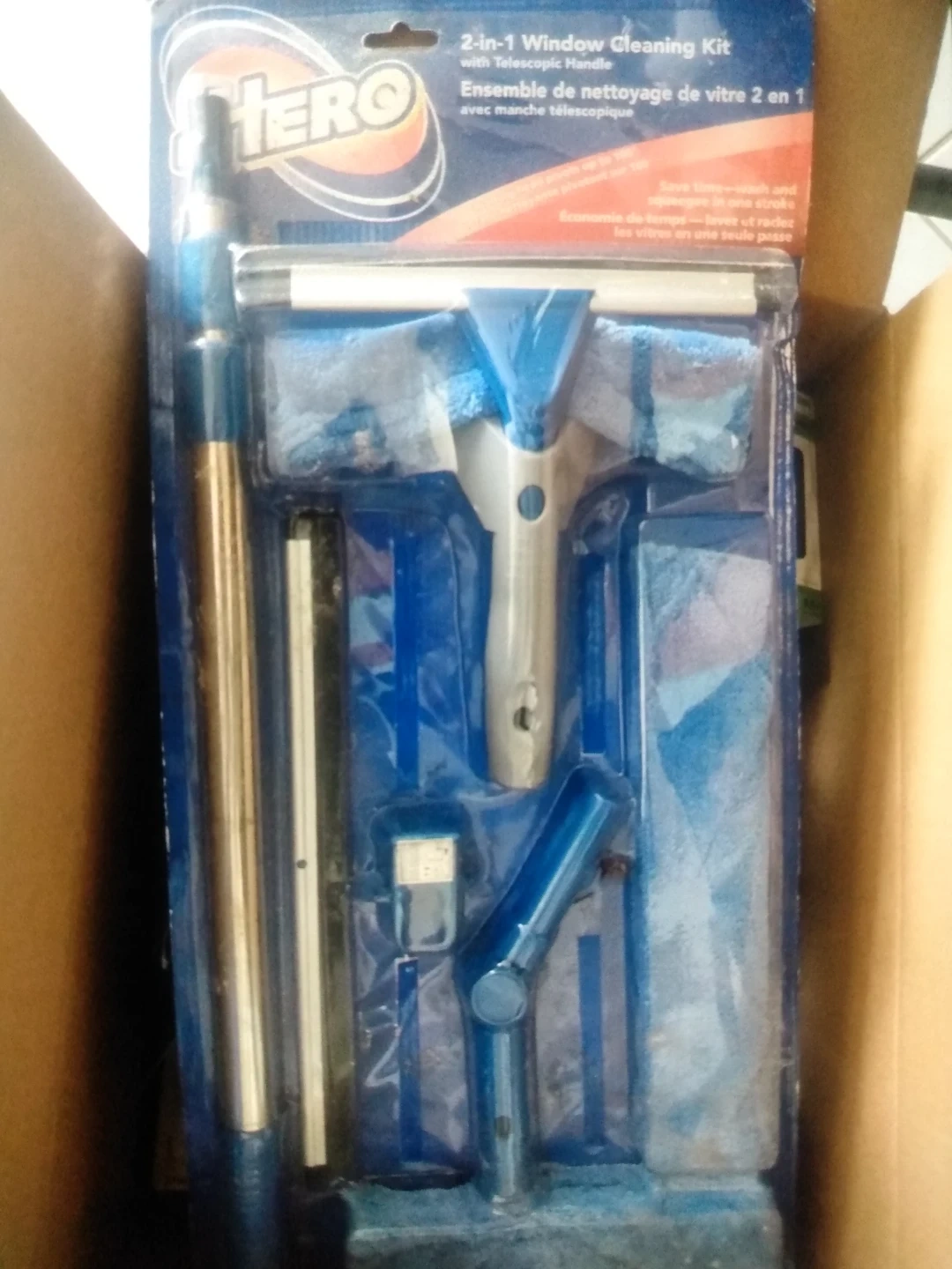 This is a HERO 2-in-1 Window Cleaning Kit. It features a telescopic handle for extended reach. This kit includes a squeegee and a scrubber for efficient window cleaning.