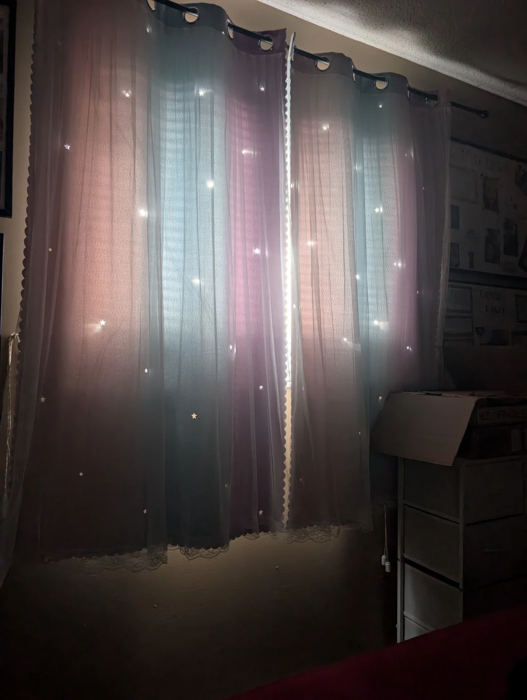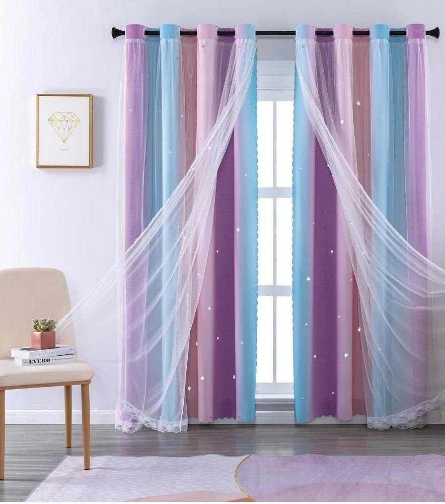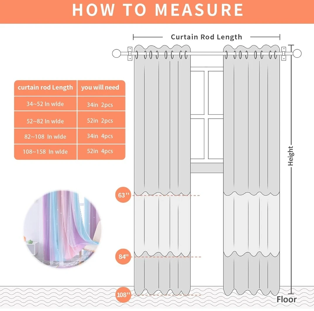 Cute pastel sheer curtains with little star cutouts. They feature a gradient of pink, blue, and purple. The sheer material lets in a lot of light and adds a whimsical touch to any room, while still being able to block out the light. I can deliver same day for an extra fee. Curtain rod not included.