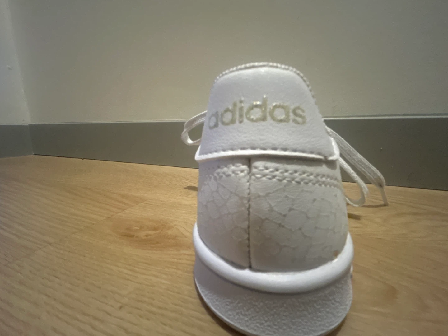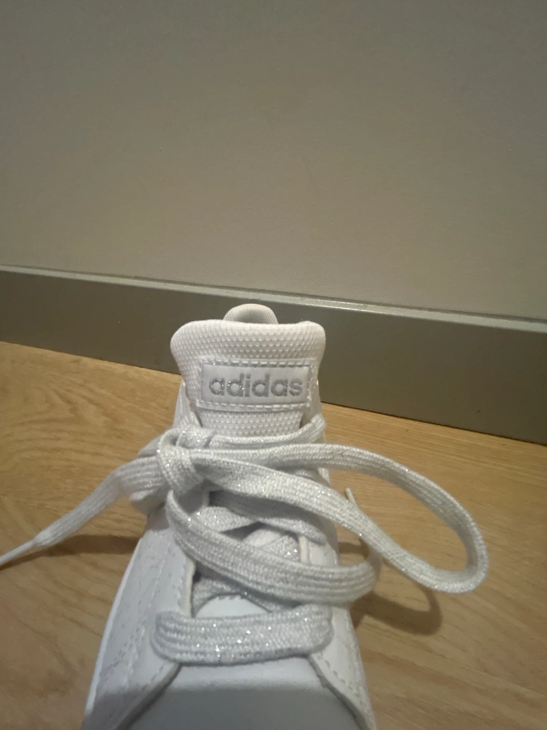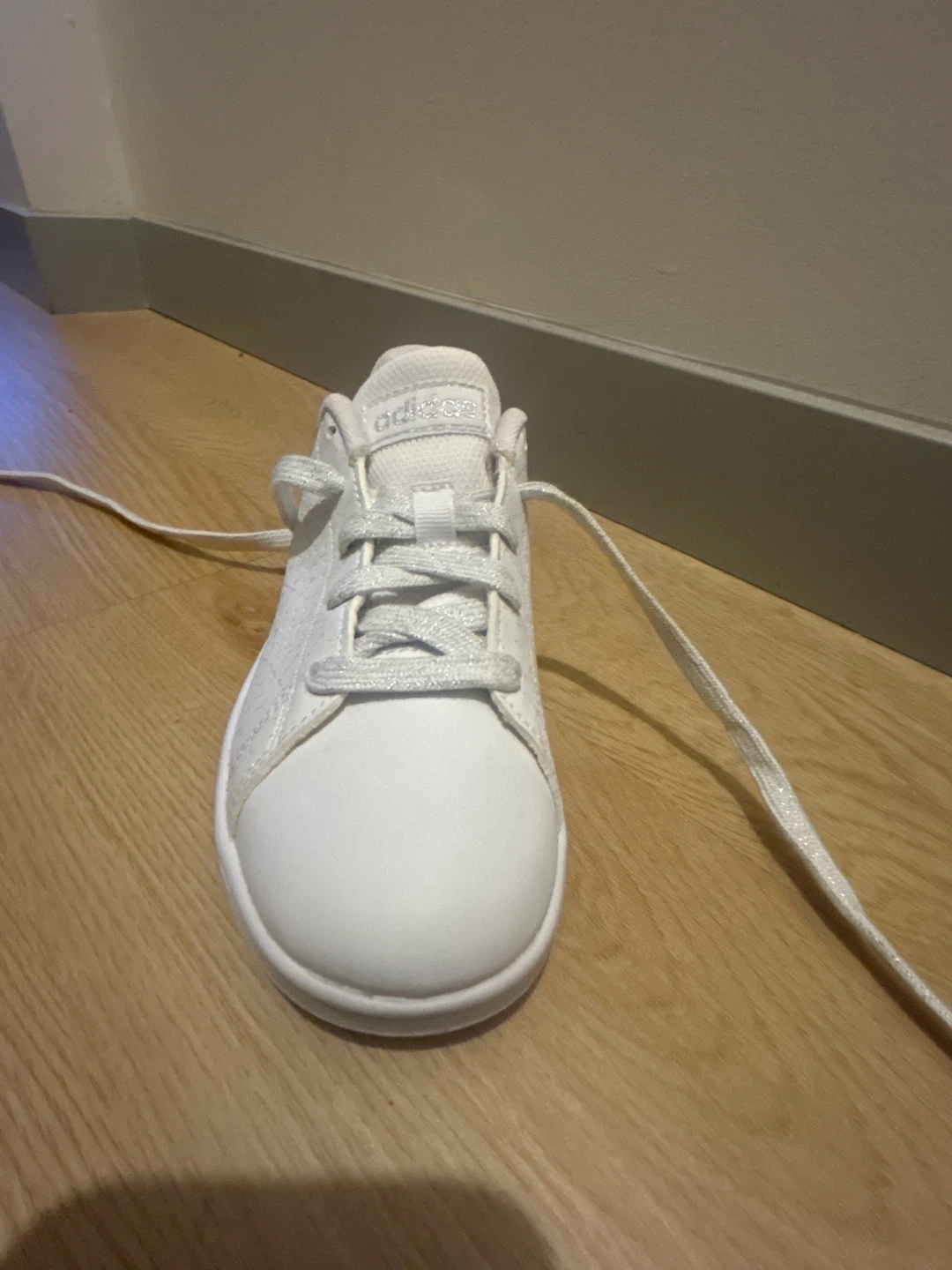 White Adidas sneakers with glitter laces. These shoes are made for everyday wear. They're a versatile addition to any casual outfit!