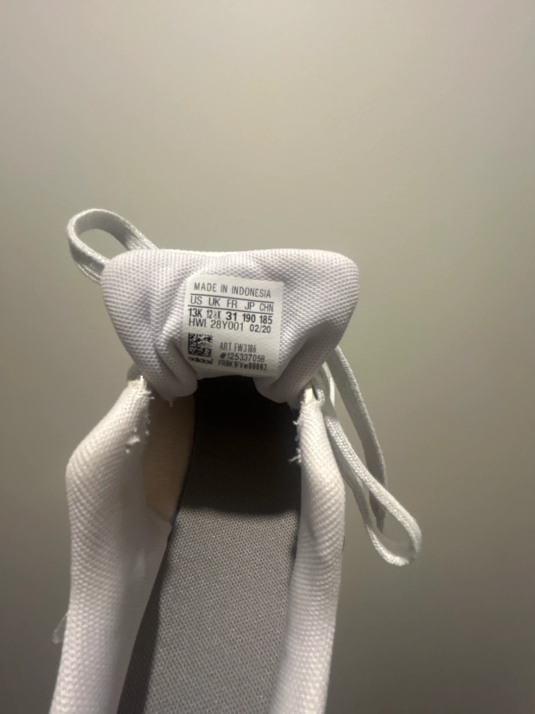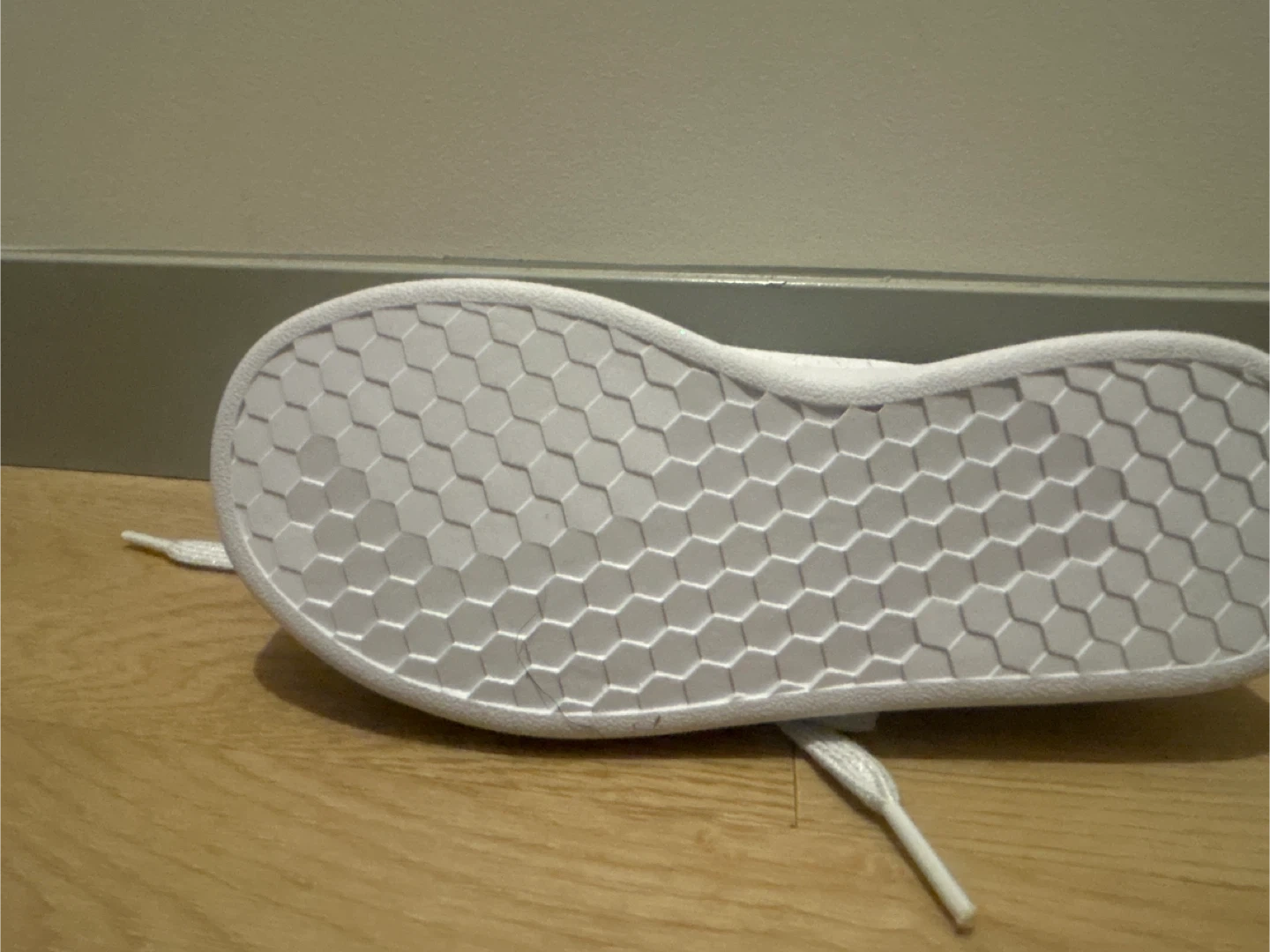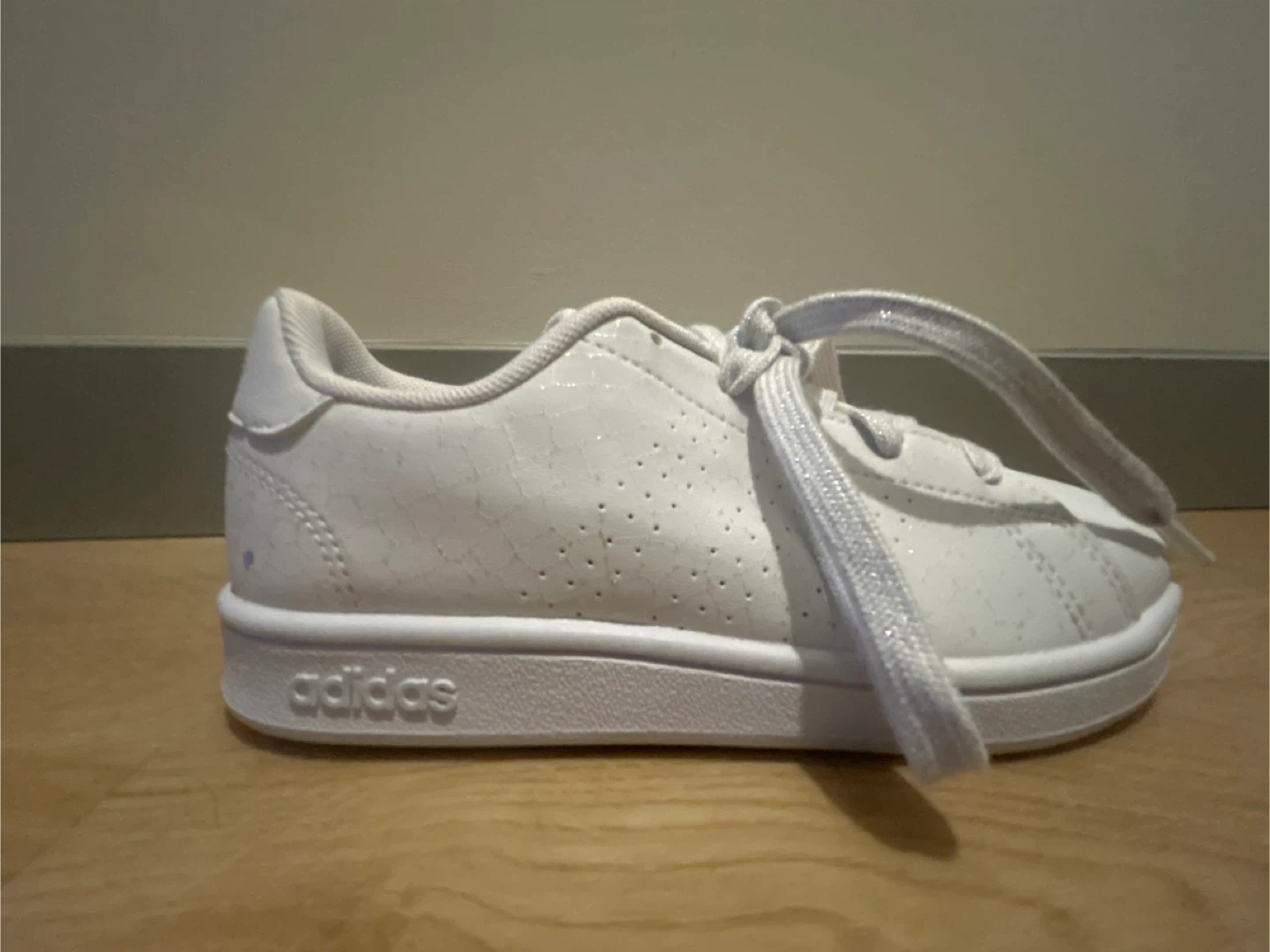 White Adidas sneakers with glitter laces. These shoes are made for everyday wear. They're a versatile addition to any casual outfit!
