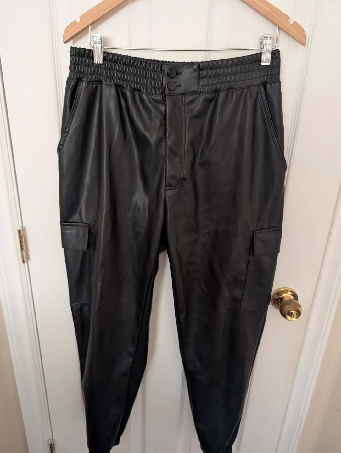 Comfortable black faux leather joggers with elastic waist and cargo pockets. Matching faux leather hoodie with drawstring and elastic cuffs. Both pieces are designed for a relaxed fit. Great for a stylish casual look!
