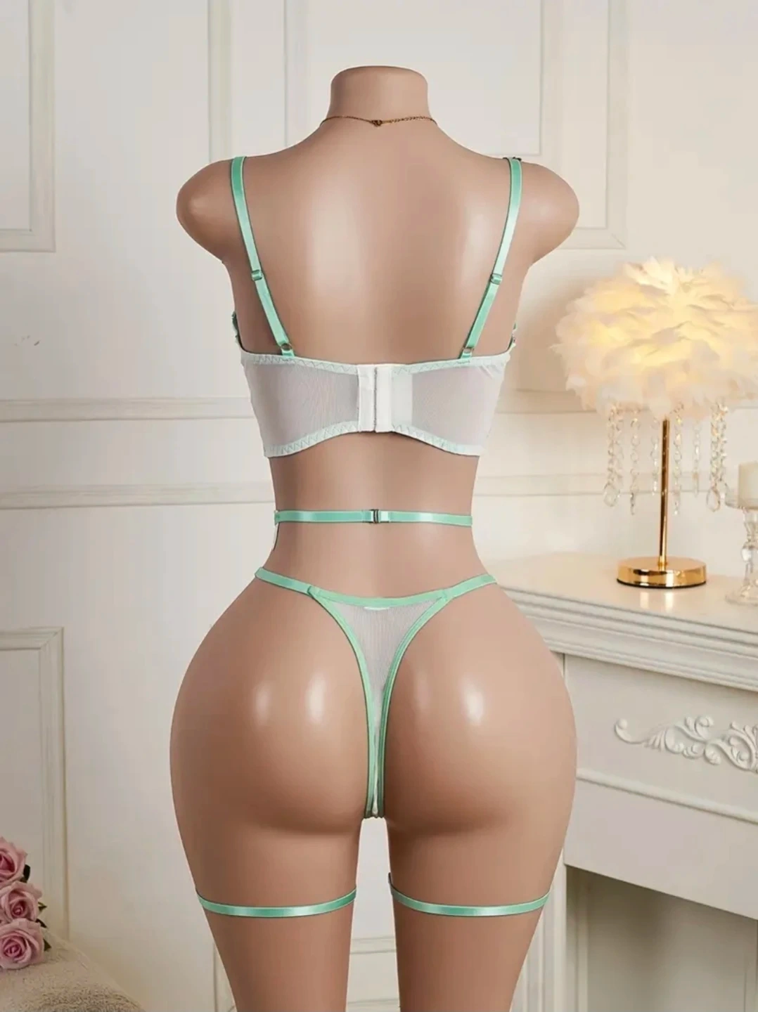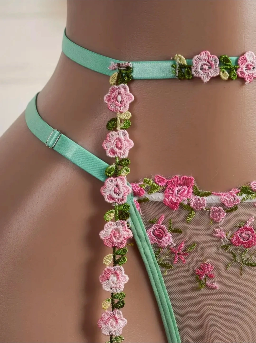 This delicate lingerie set features a sheer bralette with floral embroidery and mint green trim, paired with a matching thong and garter straps. It's made from lightweight mesh material. Adjustable straps for a comfortable fit.