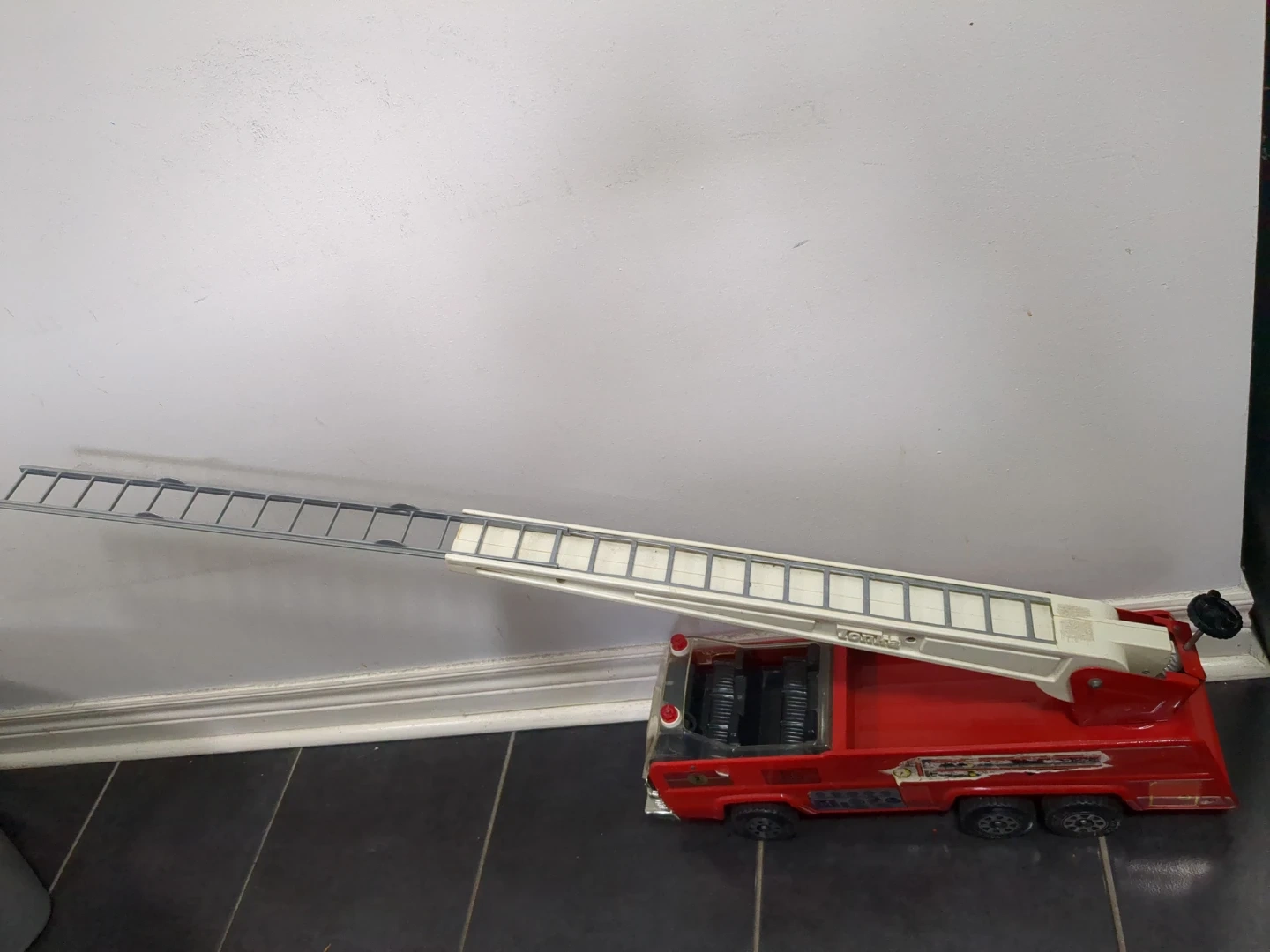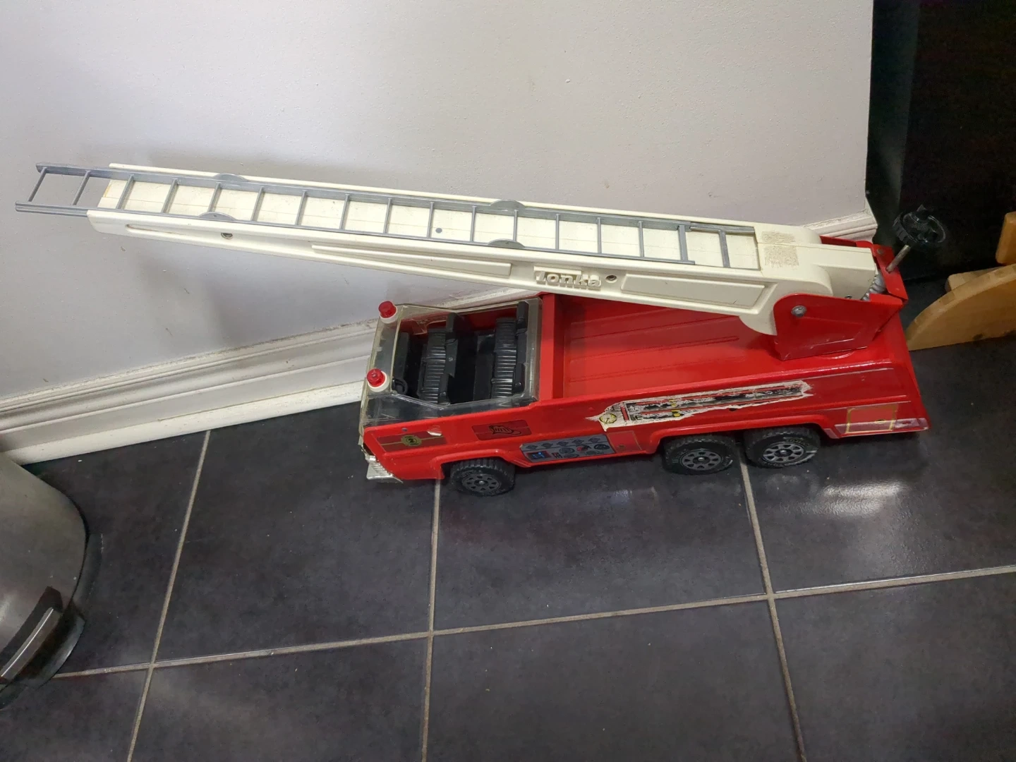 This is a classic red Tonka fire truck with a functioning ladder. It's a durable metal toy, perfect for imaginative play. The ladder extends and retracts for exciting rescue missions! Open to reasonable offers. Missing push nut for ladder.