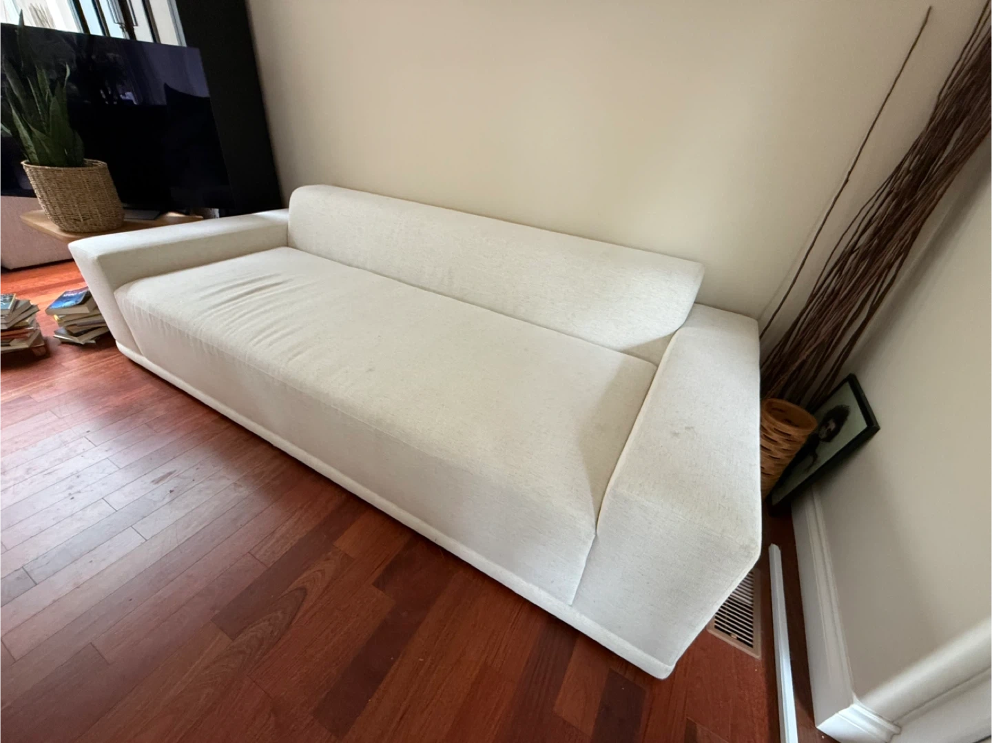 This CB2 sofa is upholstered in Nomad Fabric in Snow. It's a deep depth sofa, perfect for lounging. The fabric is performance chenille for durability.