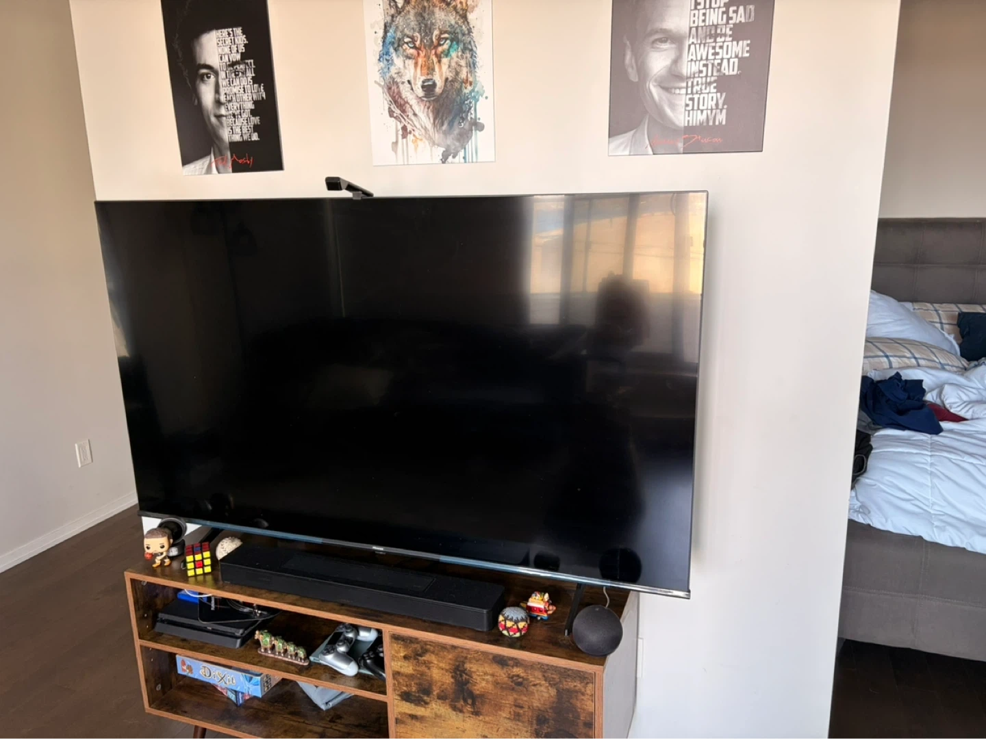 Samsung flat screen television. Includes a soundbar and gaming console. Great for entertainment!