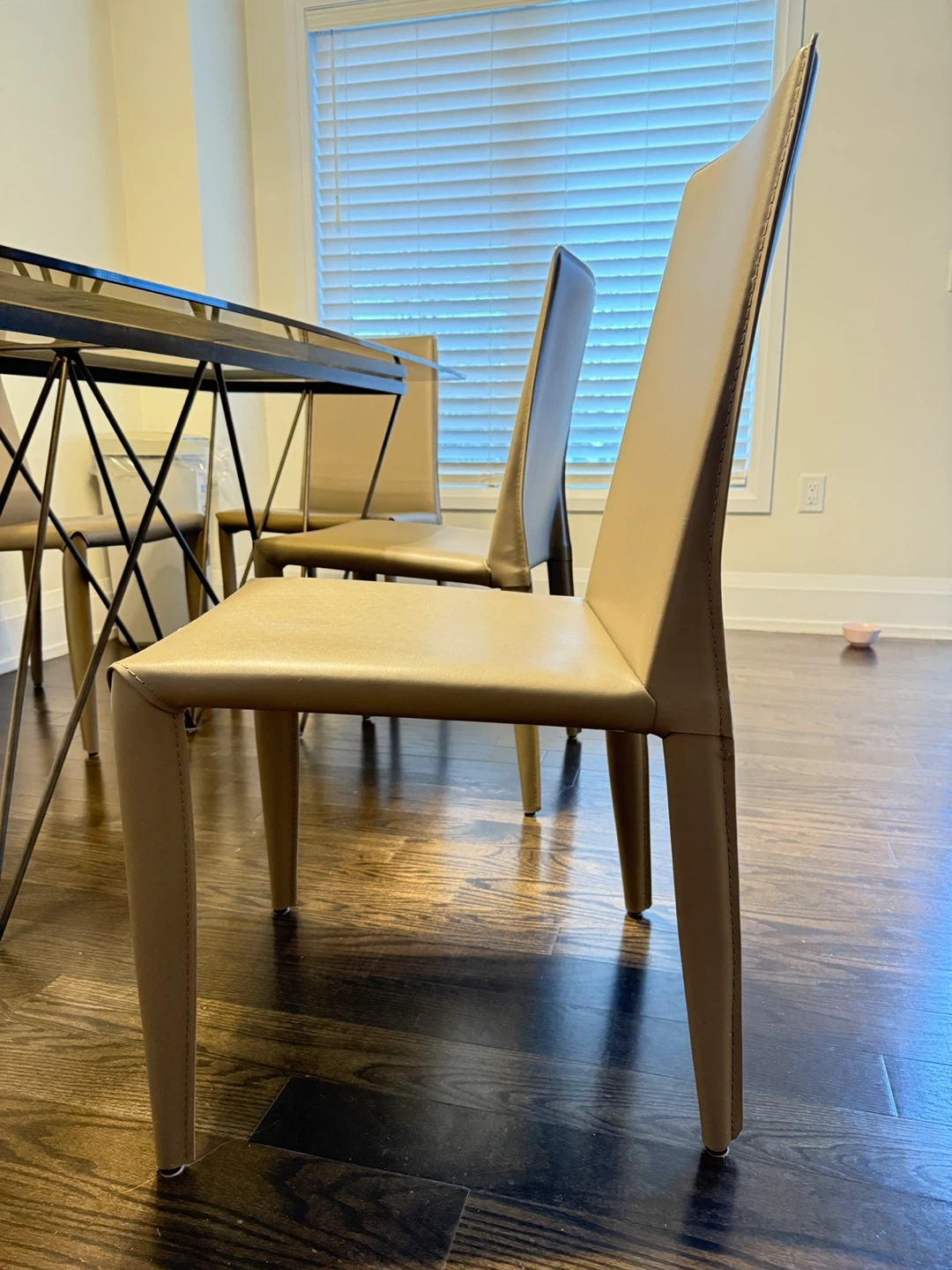 Selling a dining table with chairs. The set features a glass top table with a unique geometric metal base and accompanying chairs with a beige finish. Great for a modern dining space!
