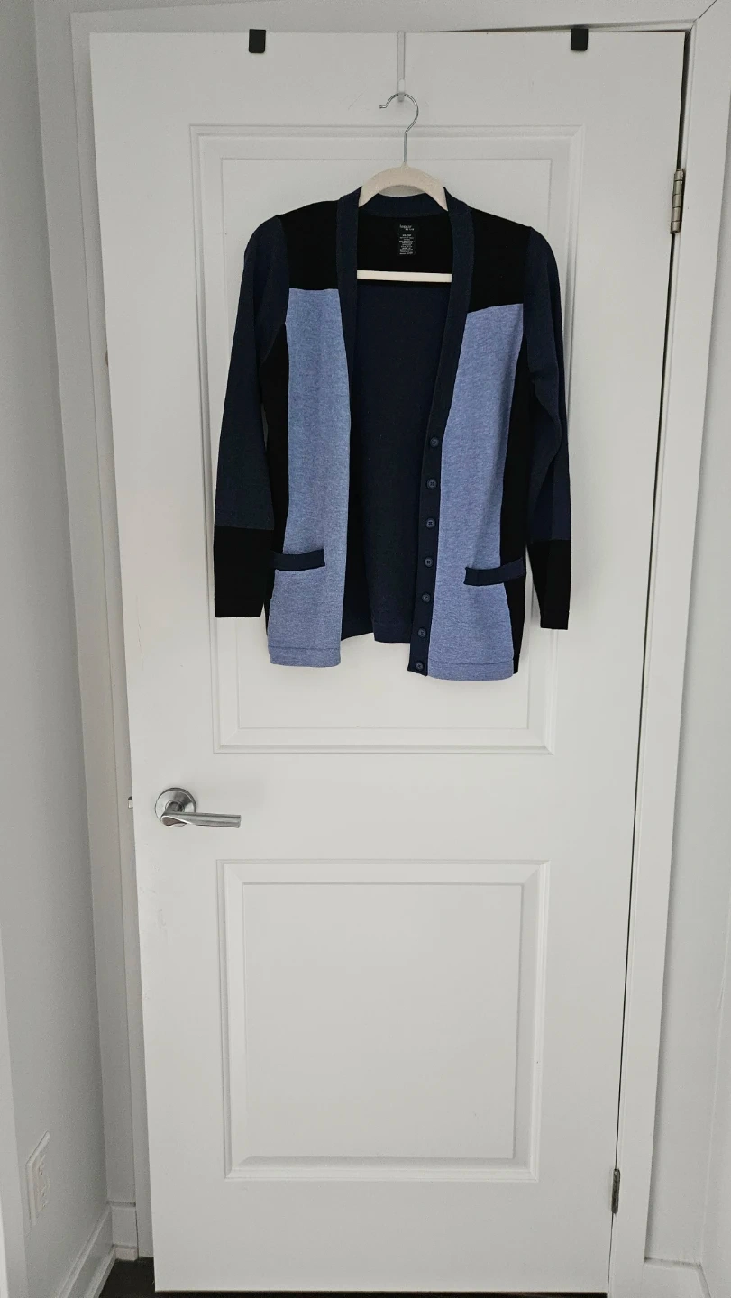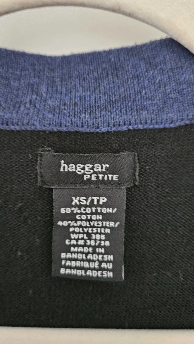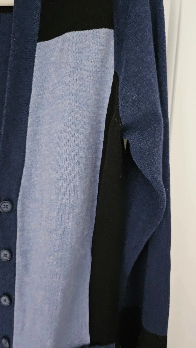 Selling a beautiful women's colour block cardigan from Haggar Petite, in size XS (also fits Size Small). It's made of 60% cotton and 40% polyester. Features button-up front and two front pockets.