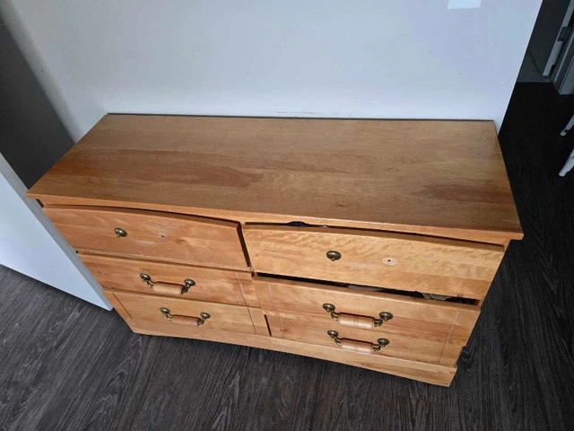 This dresser is a bit rough around the edges, as you can see in the photos, with some damage to the drawers and frame, reflected in the price. Priced to sell, this dresser could be the perfect piece for a DIY project. If the ad is still up, yes, it's still available. I'm hoping to send it to a new home. Size: 49"x16"x31".