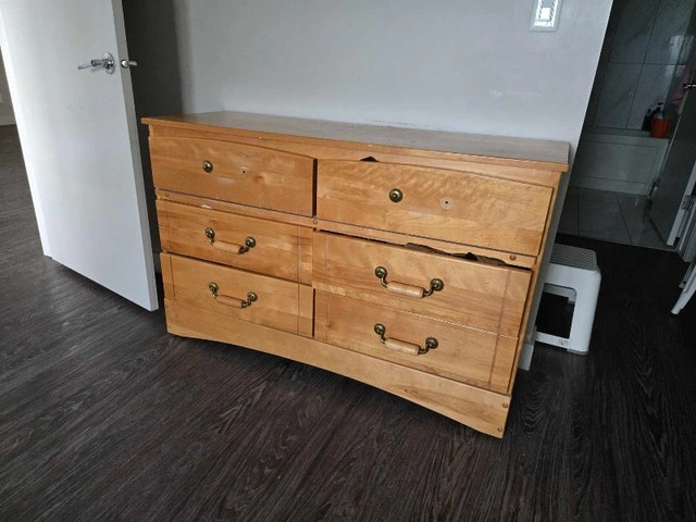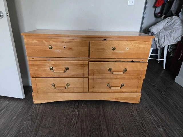This dresser is a bit rough around the edges, as you can see in the photos, with some damage to the drawers and frame, reflected in the price. Priced to sell, this dresser could be the perfect piece for a DIY project. If the ad is still up, yes, it's still available. I'm hoping to send it to a new home. Size: 49"x16"x31".