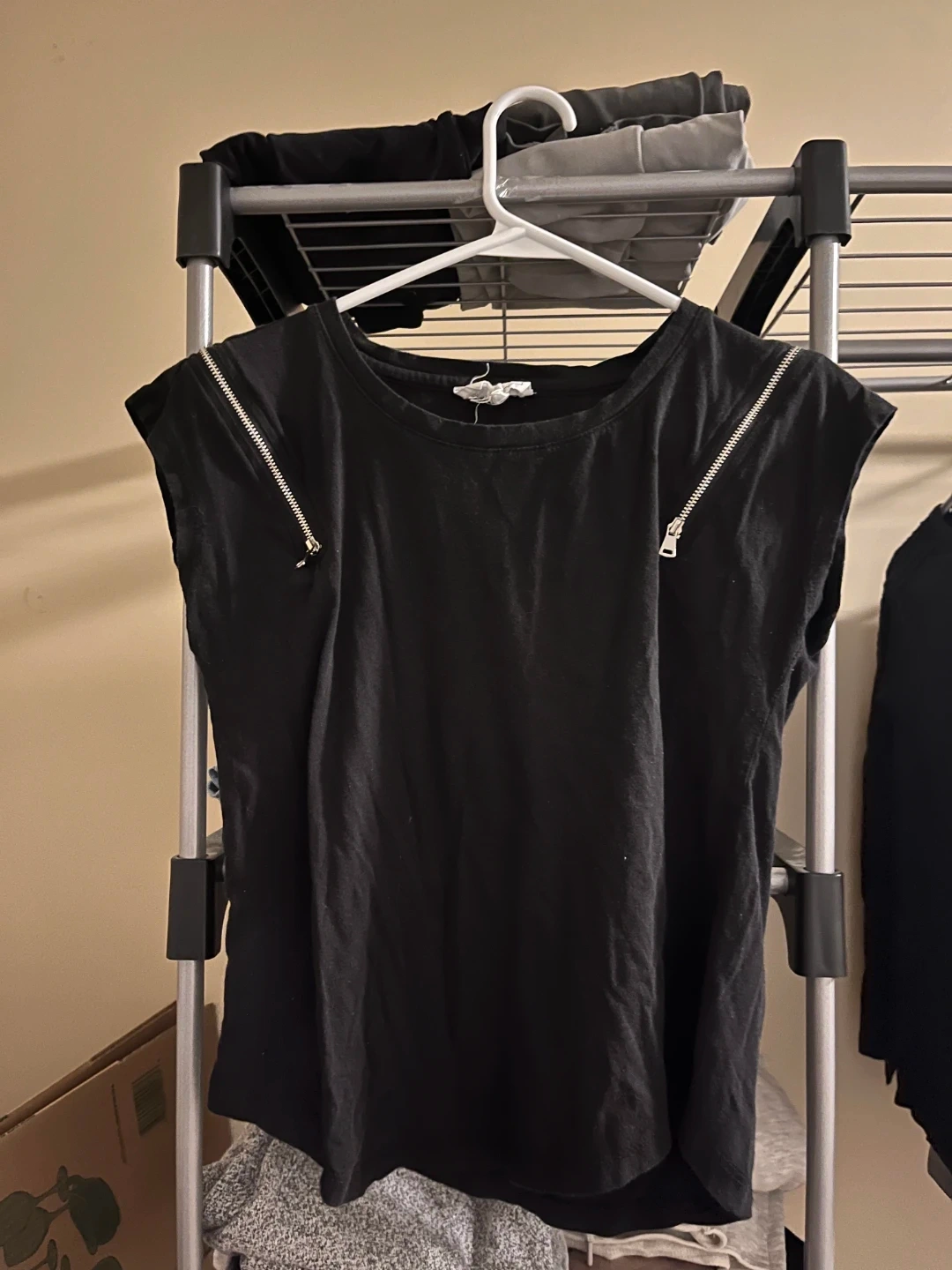 A black short-sleeved t-shirt with decorative zippers on the shoulders. It's made from a soft, comfortable fabric. This t-shirt adds a bit of edge to a casual outfit.