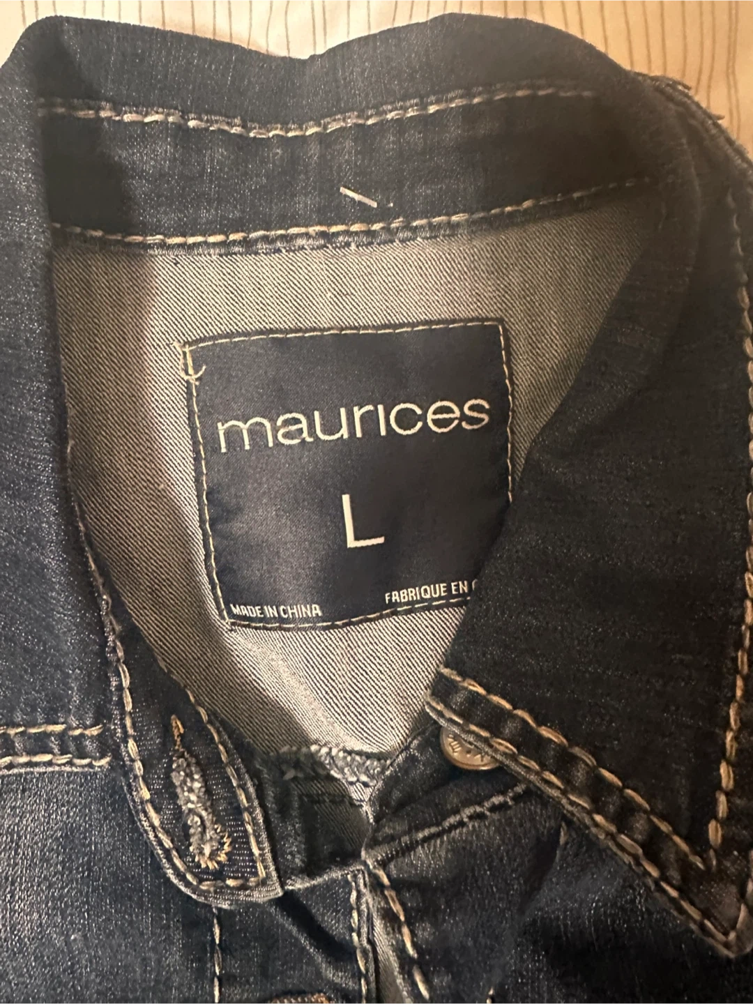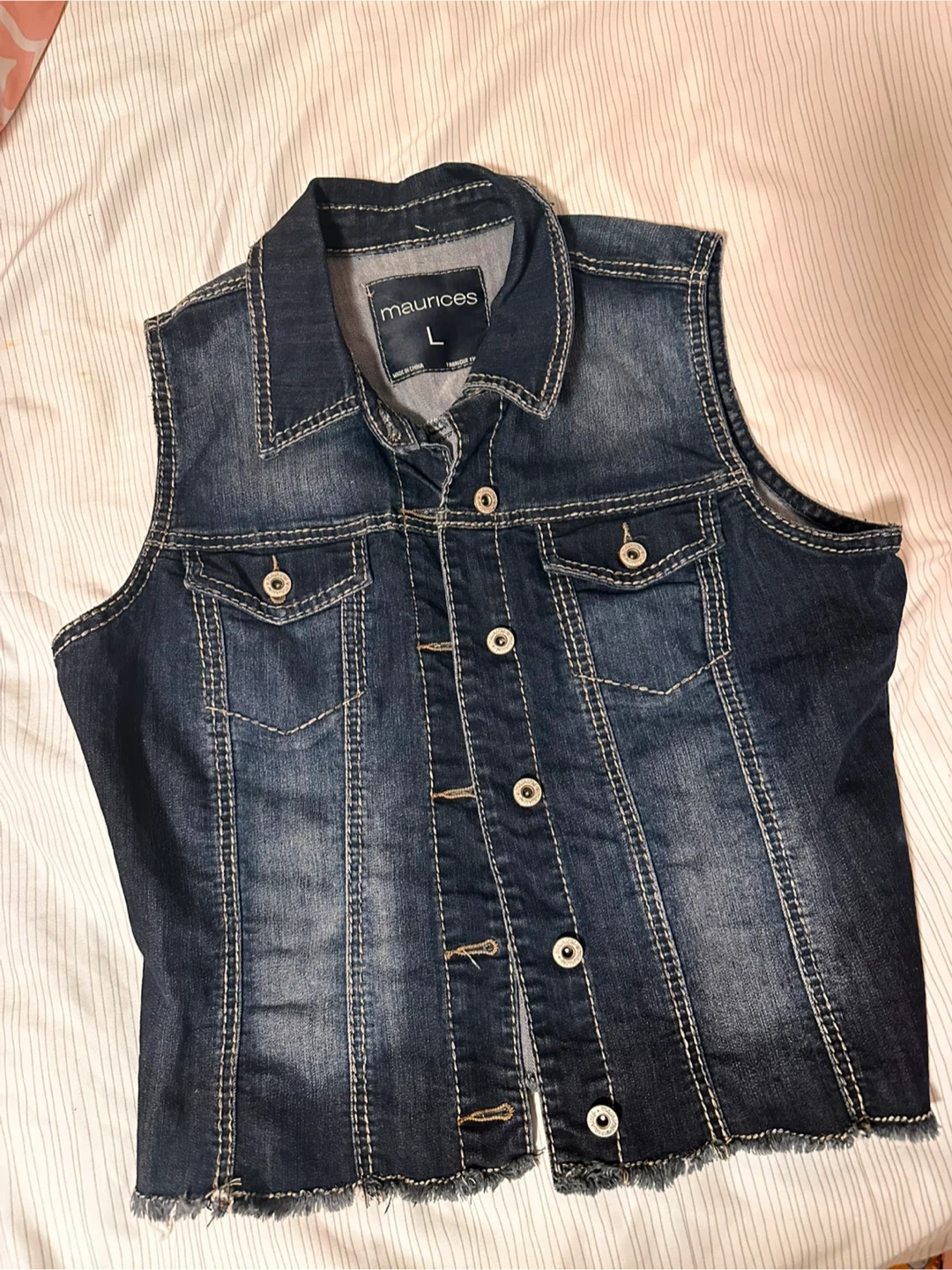 Buy & Sellmaurices Denim Vest - Size Lmaurices Denim Vest - Size L$16This is a women's denim vest from maurices. It's a size large with a frayed hem. This vest is perfect for layering over t-shirts or dresses.ConditionLike newSizeLargeBrandmauricesWHERE TO MEETCheck LocationView MapSELLERverifiedMayaBelvedere1123 reviews0 chats·0 favorites·2 viewsSEND CHAT TO SELLERHi Maya! I’m interested in your listing.Hi Maya! I’m interested in your listing.Get the Karrot app to chatSign In to chat
