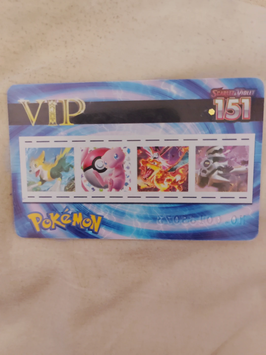 This is a Pokemon Trading Card Game VIP card. It features characters from the Scarlet & Violet 151 set. It has a unique serial number for identification.