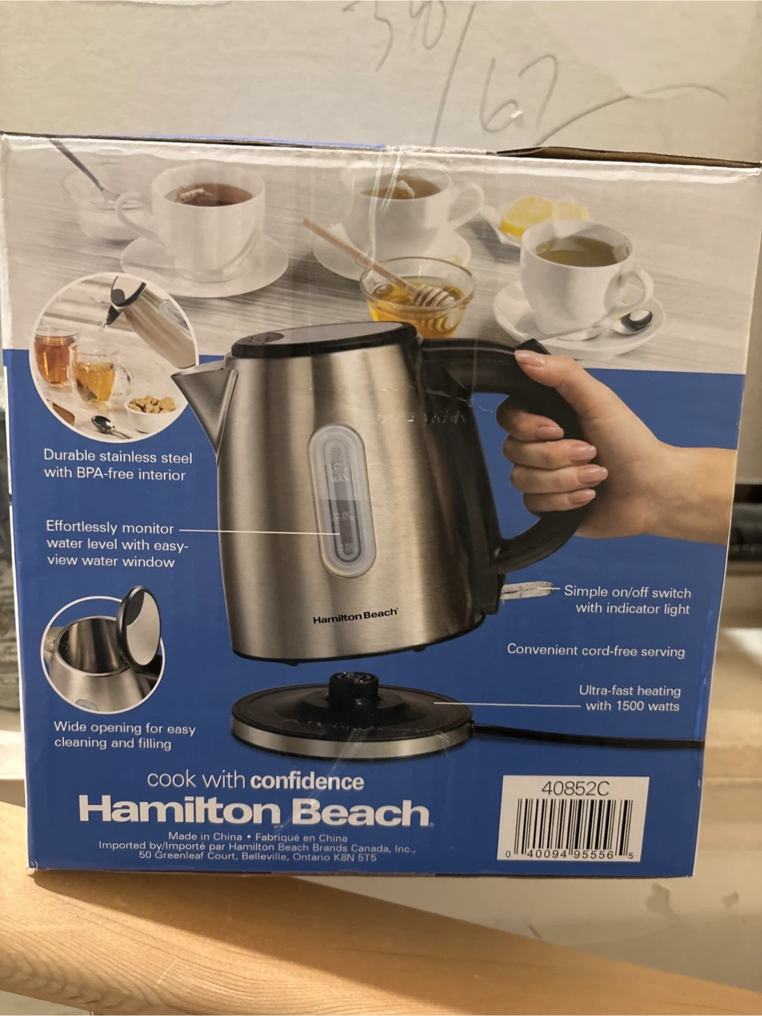 I'm selling a Hamilton Beach stainless steel kettle! It's a 1.0 litre kettle, perfect for 4 cups. It features ultra-fast heating with 1500 watts, and an auto shutoff for peace of mind and boil-dry protection. It has a durable stainless steel with BPA-free interior and an easy-view water window. It also features a simple on/off switch with indicator light and convenient cord-free serving