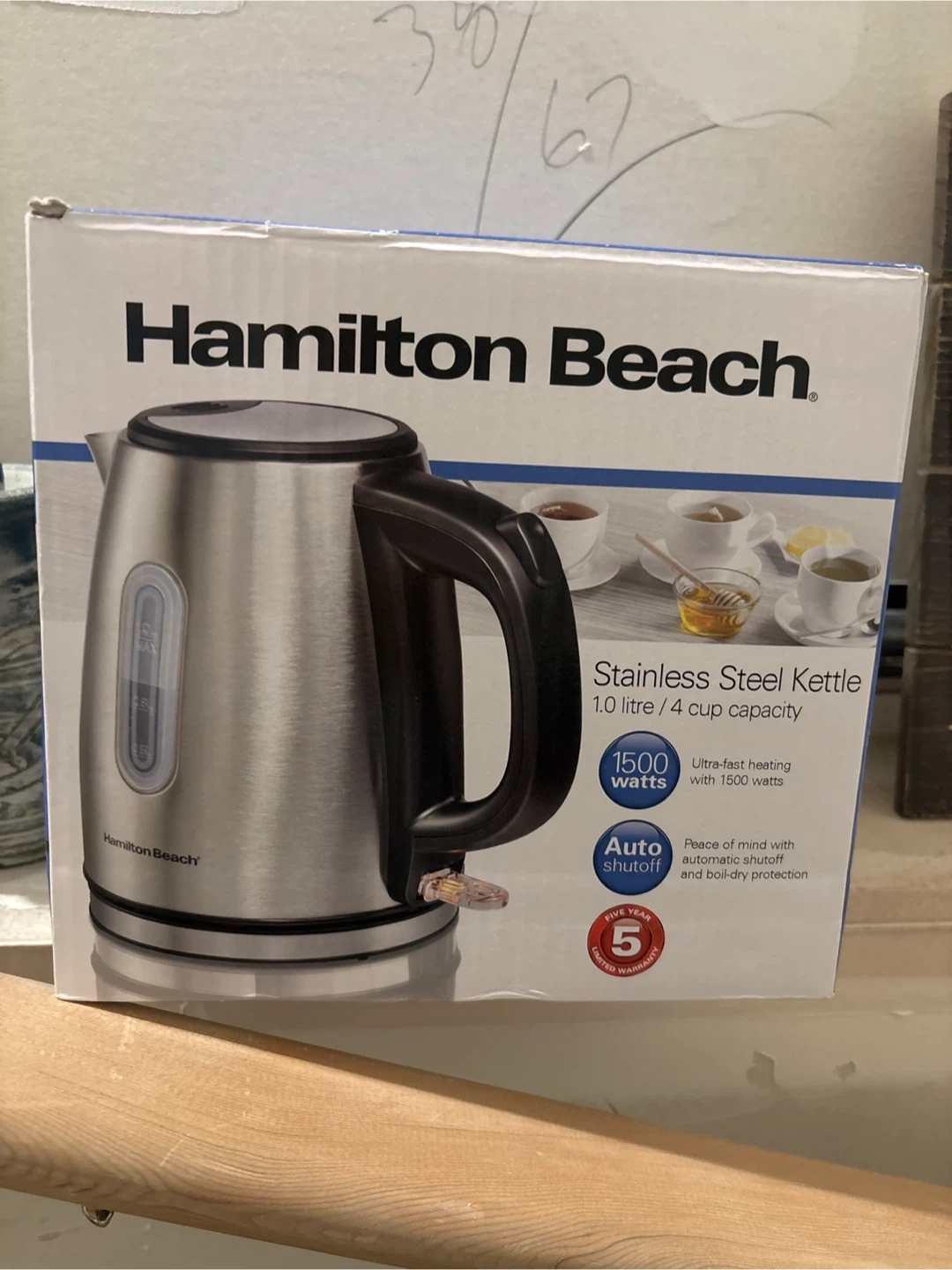 I'm selling a Hamilton Beach stainless steel kettle! It's a 1.0 litre kettle, perfect for 4 cups. It features ultra-fast heating with 1500 watts, and an auto shutoff for peace of mind and boil-dry protection. It has a durable stainless steel with BPA-free interior and an easy-view water window. It also features a simple on/off switch with indicator light and convenient cord-free serving