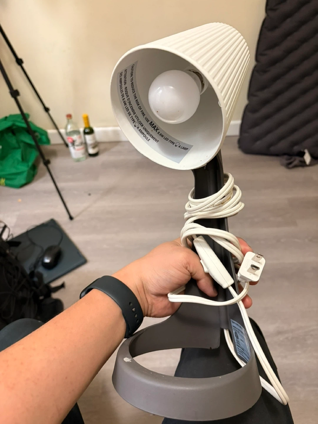 A white pleated desk lamp. It has a flexible neck and a sturdy base. This lamp is perfect for a desk or bedside table.
