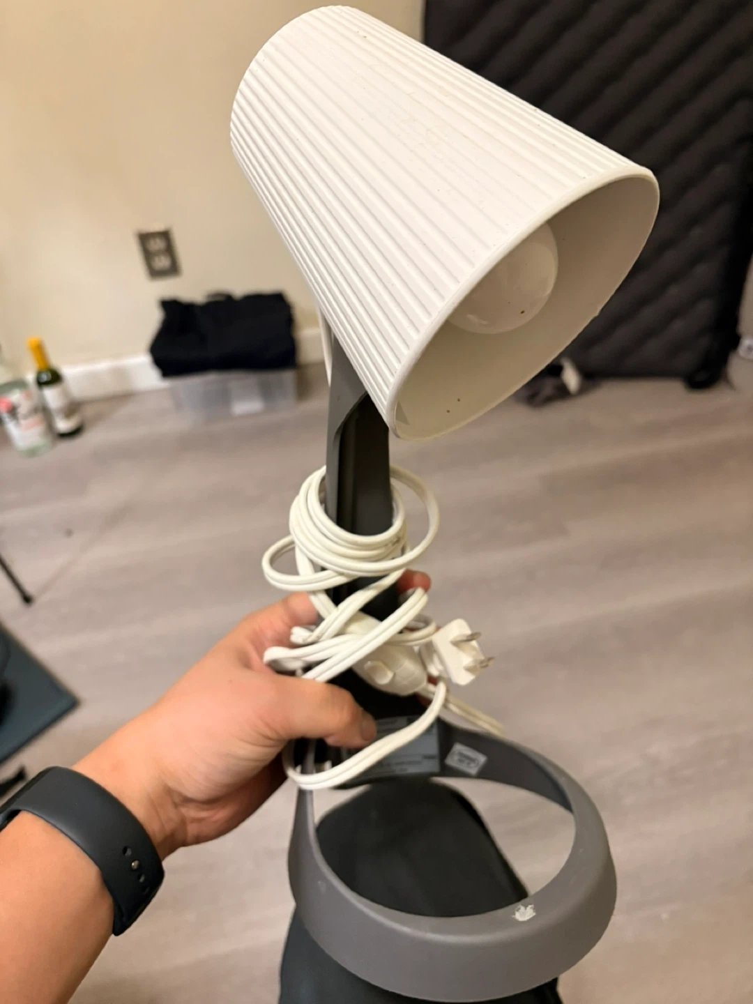 A white pleated desk lamp. It has a flexible neck and a sturdy base. This lamp is perfect for a desk or bedside table.