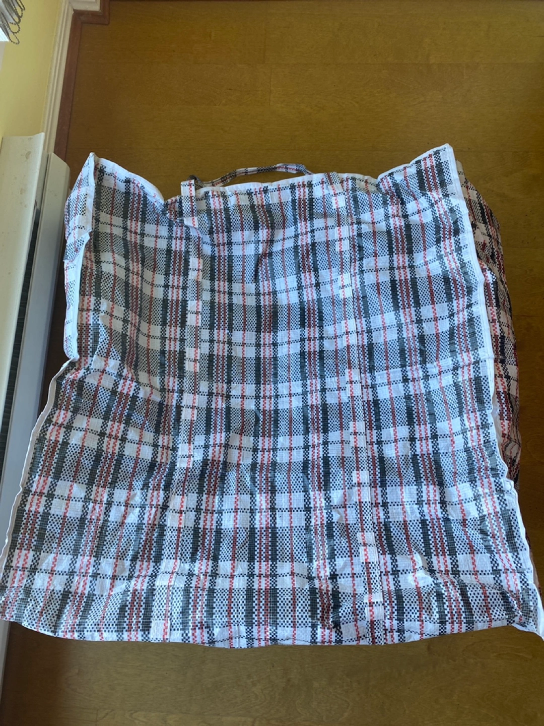 Spacious reusable shopping bag. Red, black and white plaid pattern.