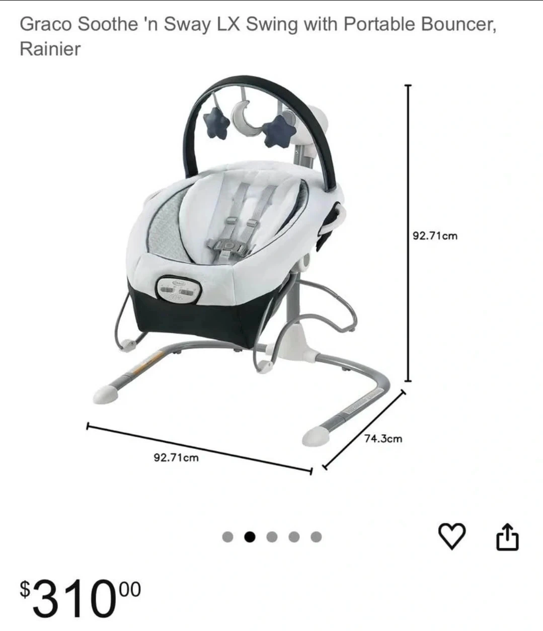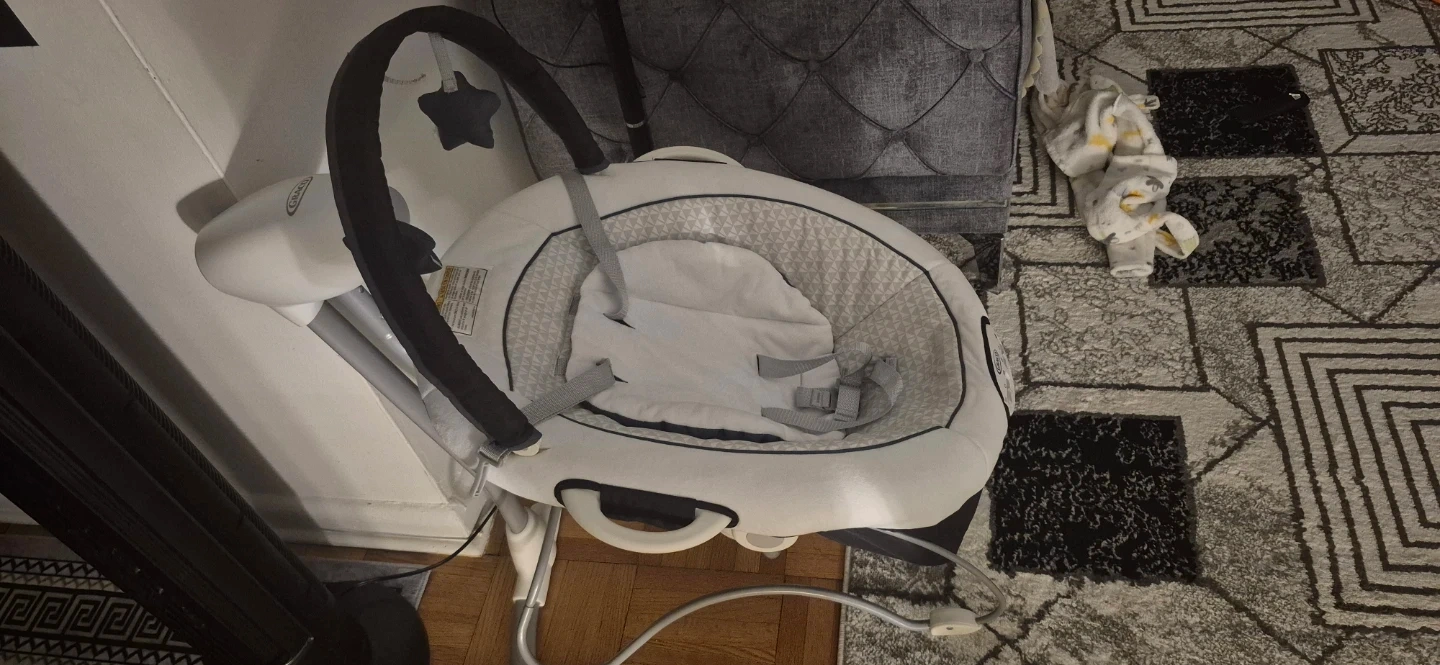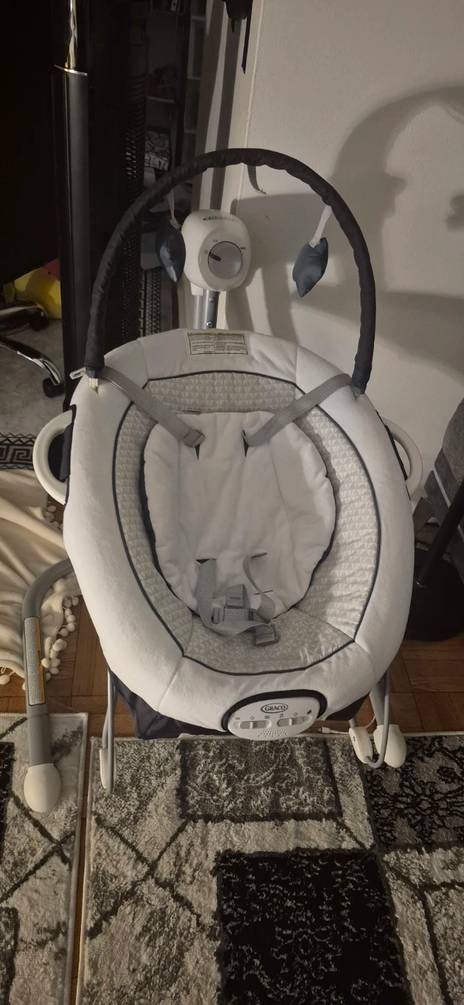 This is a Graco baby swing. It's white and grey with a padded seat and harness. Includes a toy bar with hanging plush toys. This swing is great for keeping little ones comfortable and entertained.