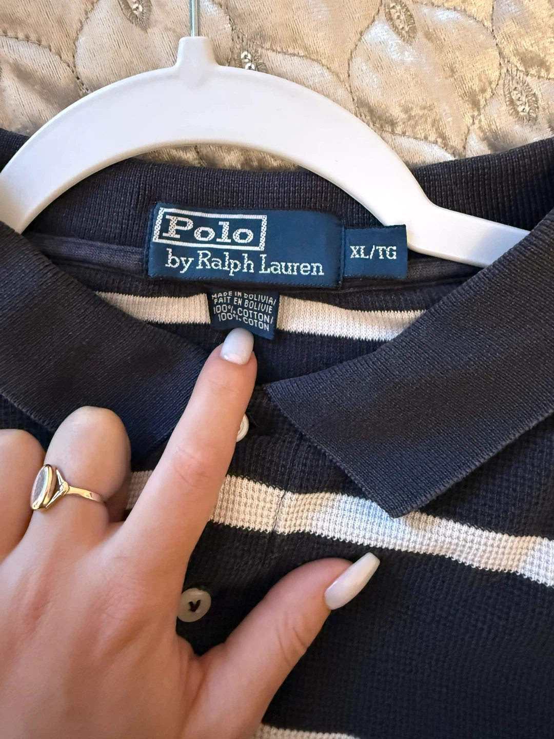 Navy knit polo with white horizontal stripes and signature embroidered logo on the chest. Feels more like a lightweight sweater than a regular polo (warm, soft, and comfortable). Long sleeves with ribbed cuffs and a buttoned collar. Great for everyday wear. In good used condition