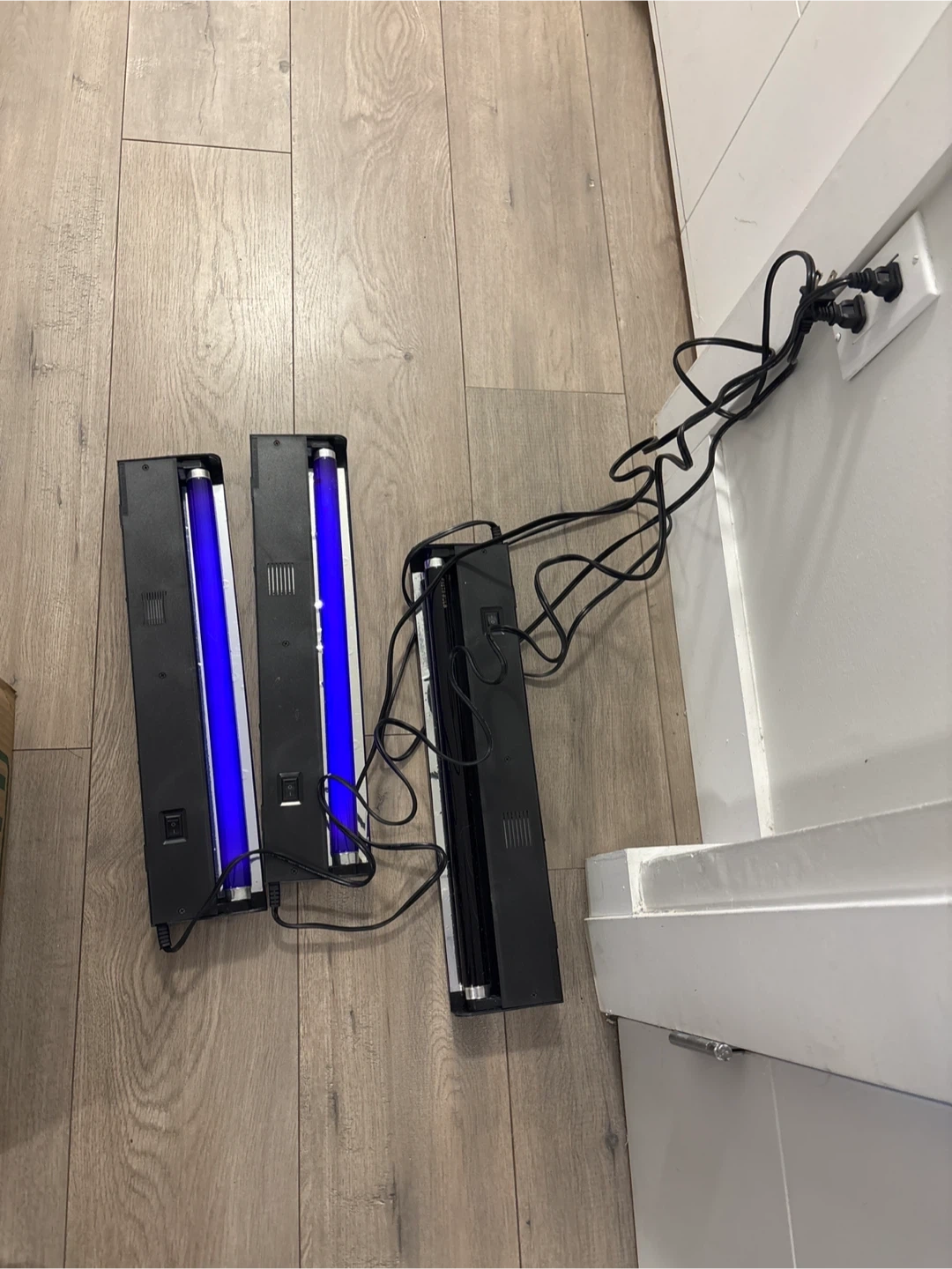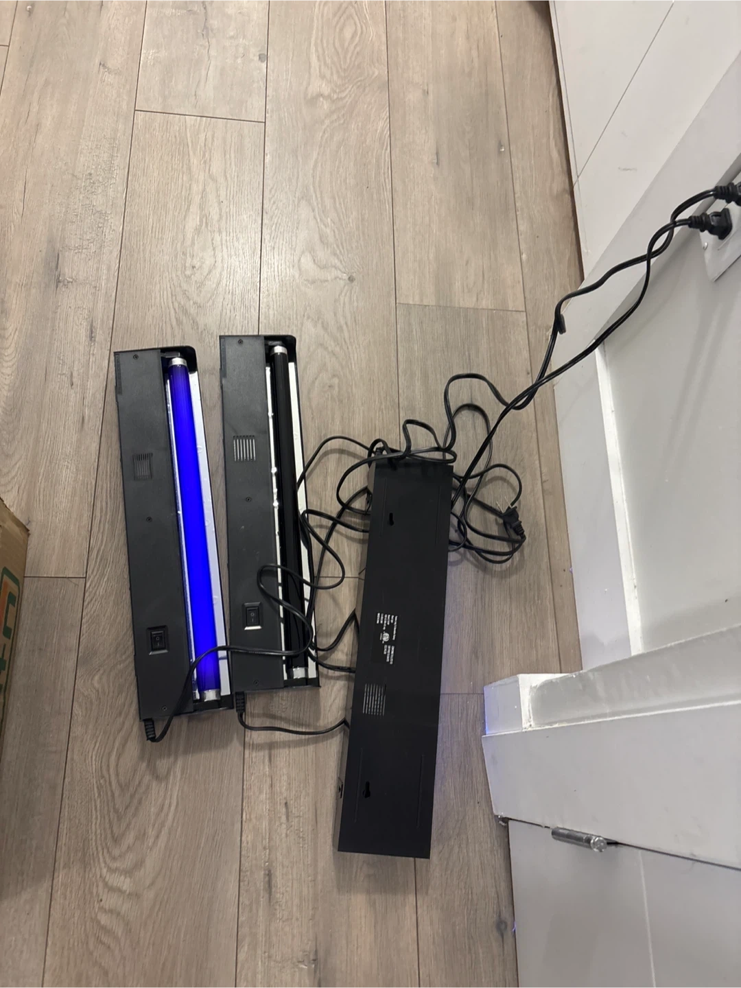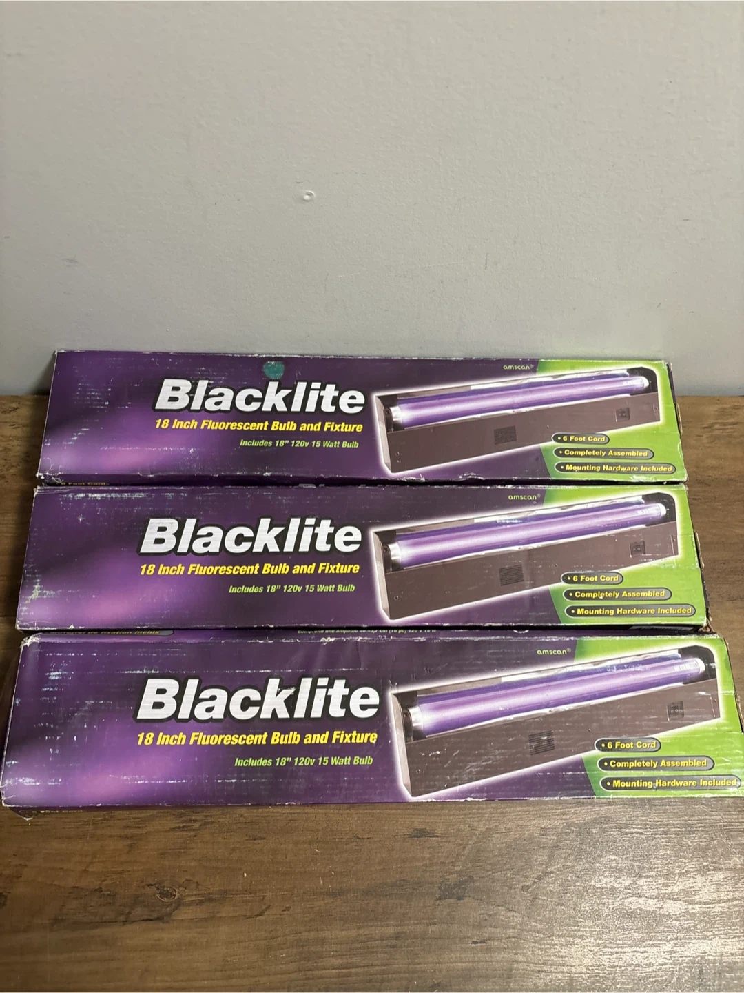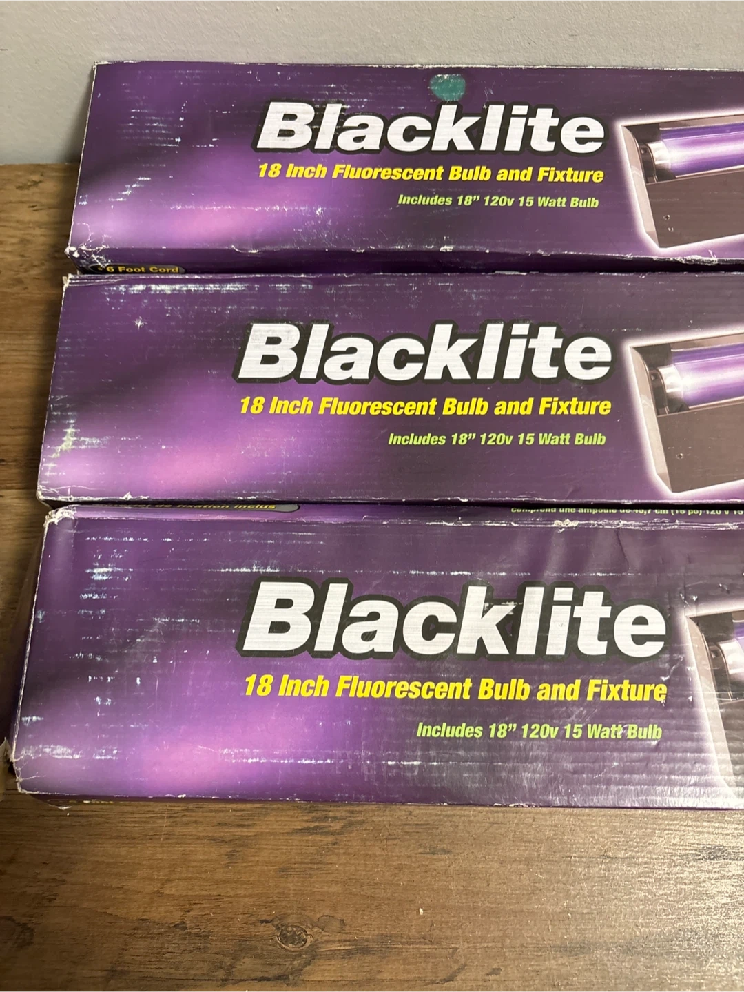 Three Blacklite 18-inch fluorescent bulb and fixture sets. Each includes an 18" 120V 15 Watt bulb, a 6-foot cord.