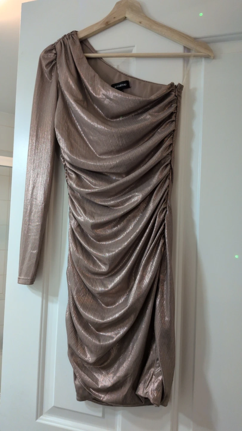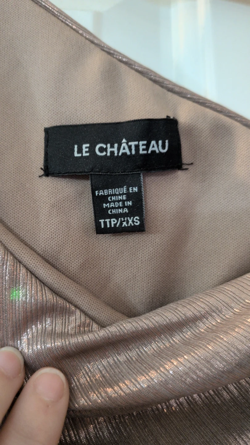 This Le Château dress features a stylish ruched design and a flattering one-shoulder silhouette. It's made from a shimmering pink fabric for a touch of glamour. The size is TTP/XXS. It does not show well on camera but the color is a shiny dusty rose gold, it is also very stretchy I would consider it a small. It is perfect for homecoming or cocktail event dress.