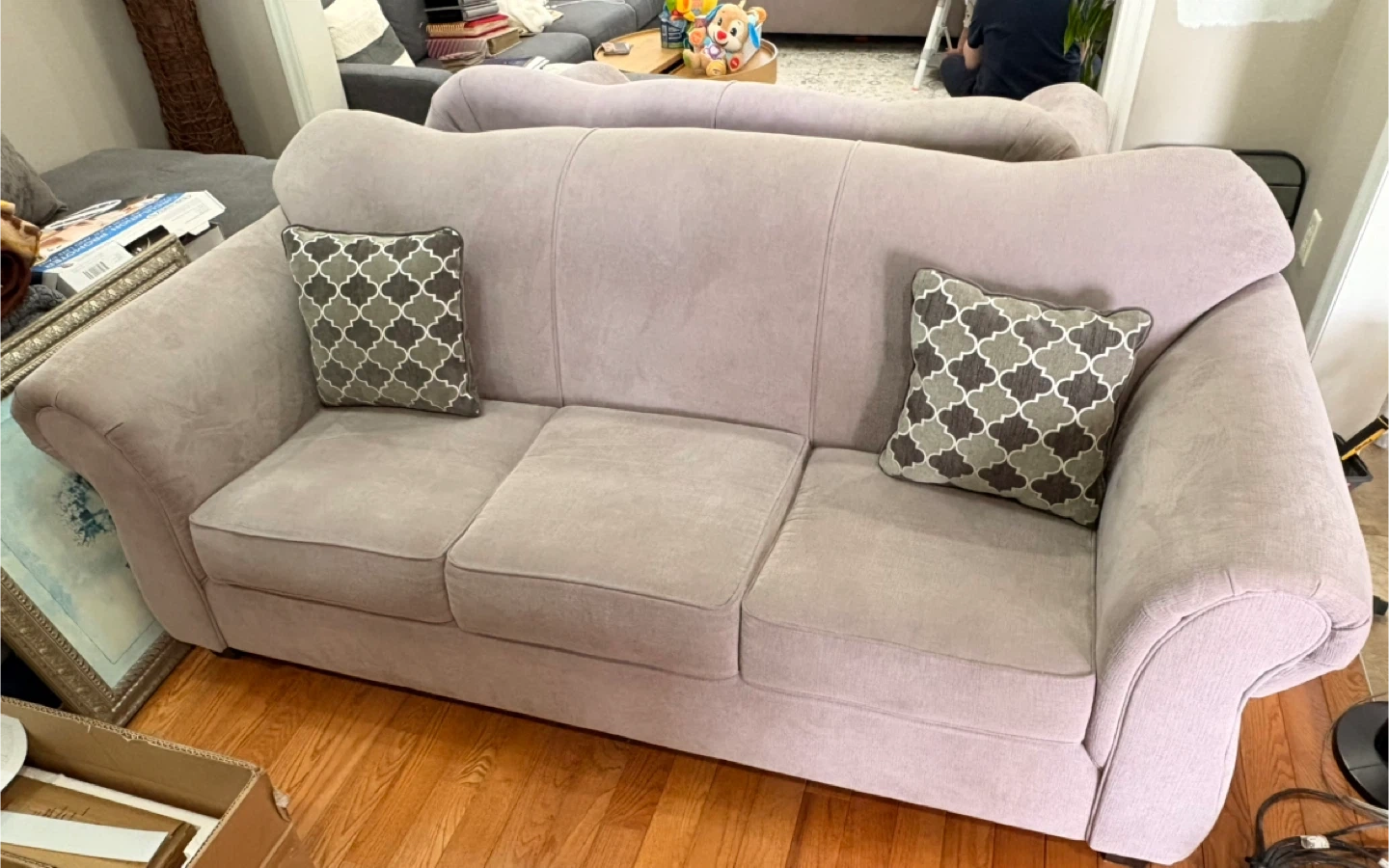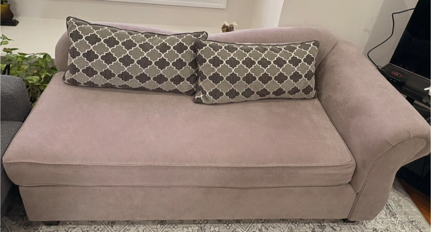 Grey fabric loveseat, three seater, and chaise. Comes with four decorative throw pillows and two lumbar pillows. Upholstery is soft to the touch.