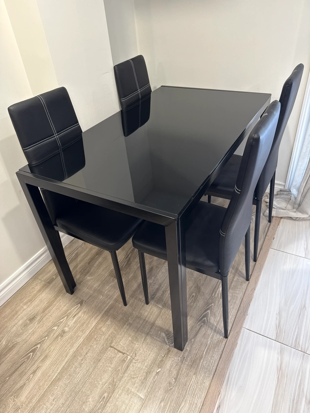 Modern black dining set featuring a glossy rectangular table with four matching chairs. The chairs have a sleek design with white stitching details. This set is great for smaller dining areas or kitchens.