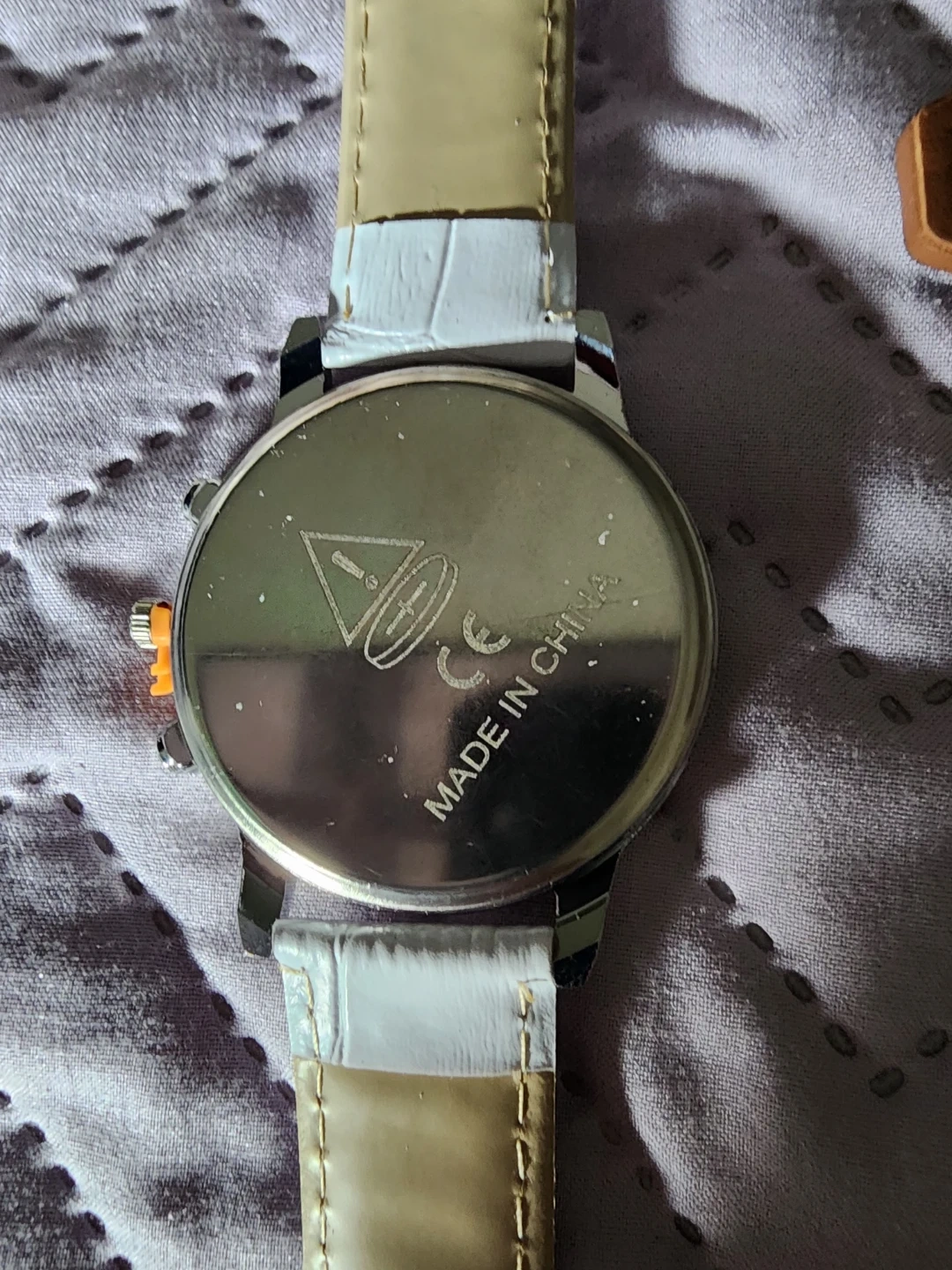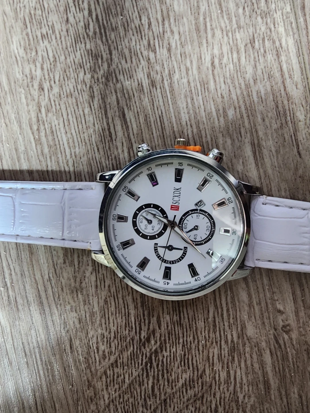 This is a white leather strap watch. It has a silver-tone case and a white dial with multiple subdials. The band is made of textured leather.