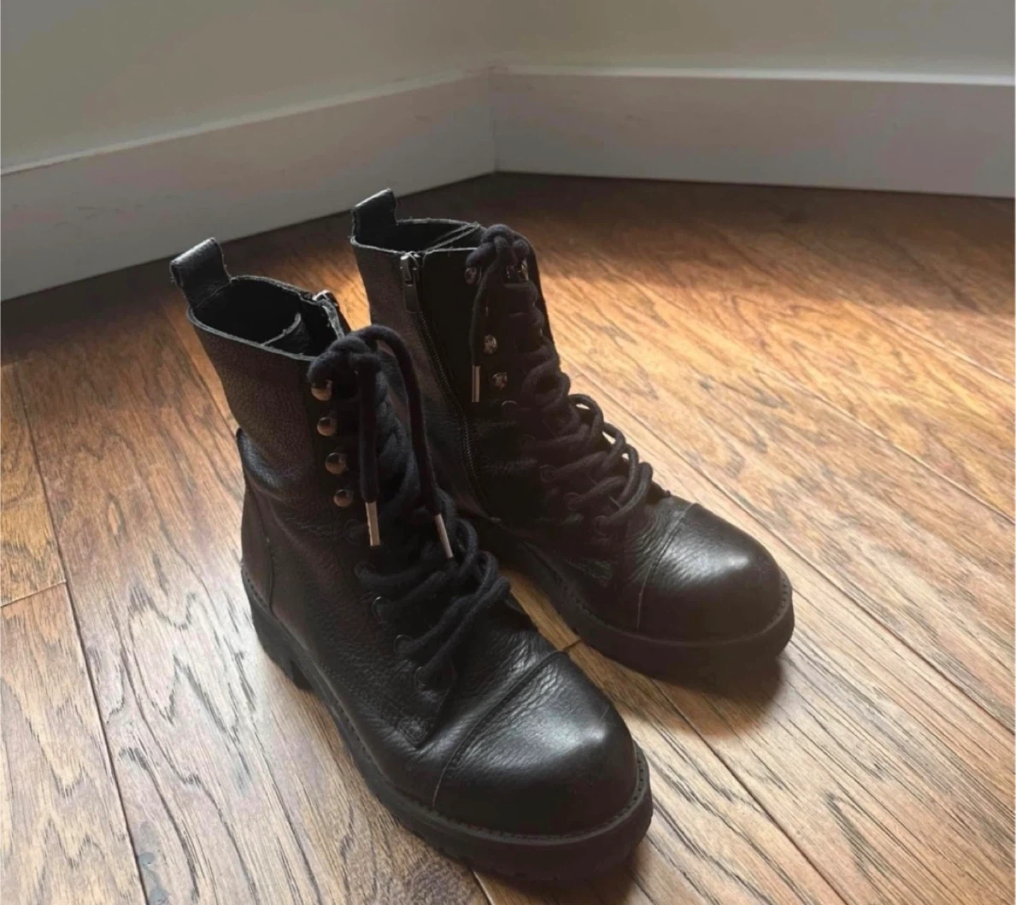 These black combat boots are made of leather. They have laces and a side zipper for easy on and off. The sole is a sturdy, grippy material. They're great for everyday wear!