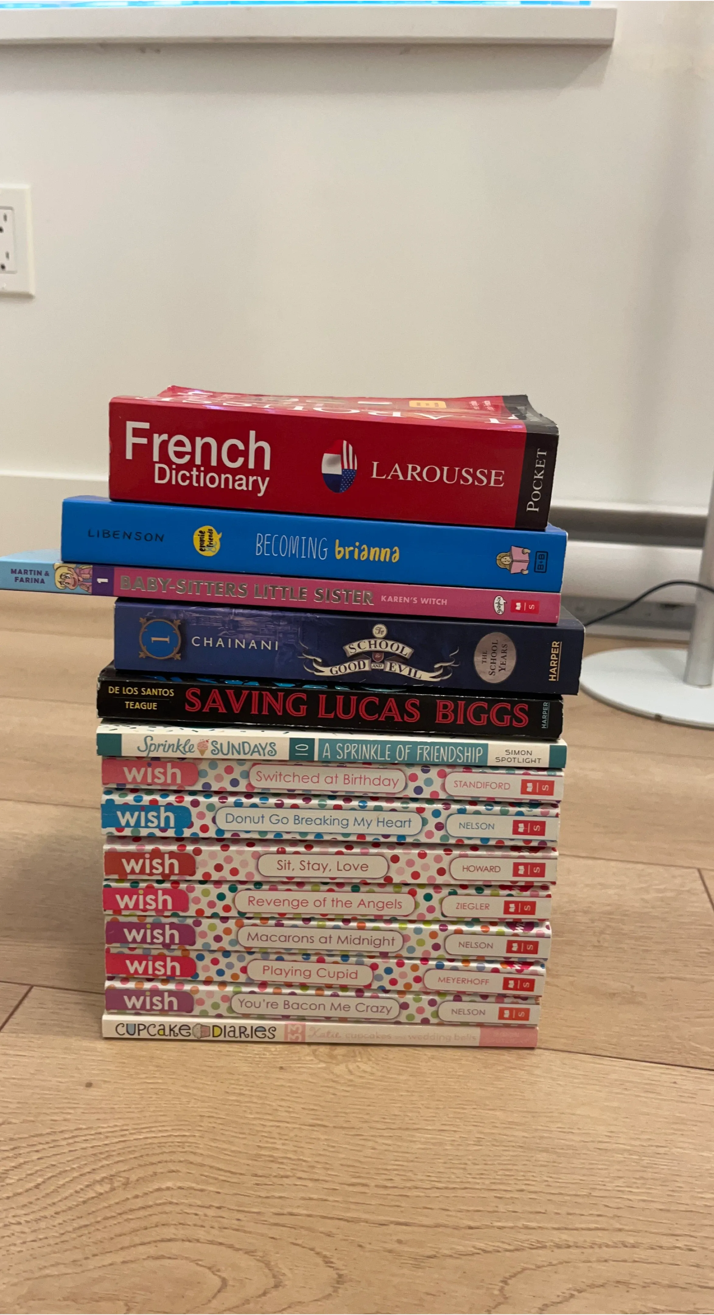 Includes "Becoming Brianna", "Baby-Sitters Little Sister", "Saving Lucas Biggs", "A Sprinkle of Friendship", and others. Also features a "Larousse French Dictionary". These books are great for young readers. A mix of fiction and educational titles are included.