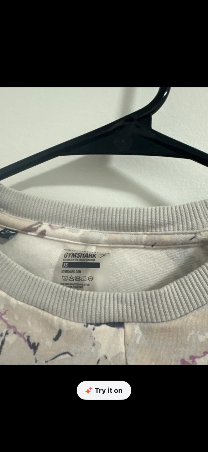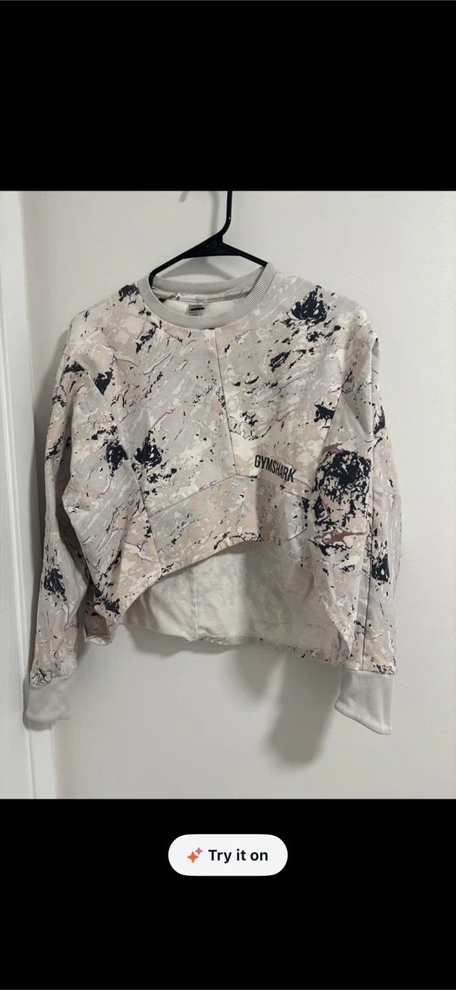 This is a Gymshark crewneck sweatshirt in size XS. It features an abstract print with grey, beige, and black tones. The material is soft and comfortable. Pick up cash only