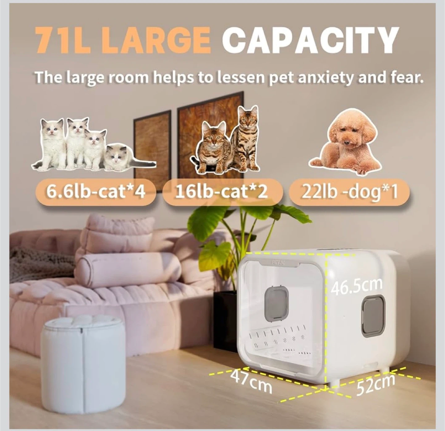 This automatic pet dryer box features a 71L capacity and 360° surround air supply for efficient pet drying. It offers a quiet operation, saving you time and money. Dimensions are 47cm x 52cm x 46.5cm.